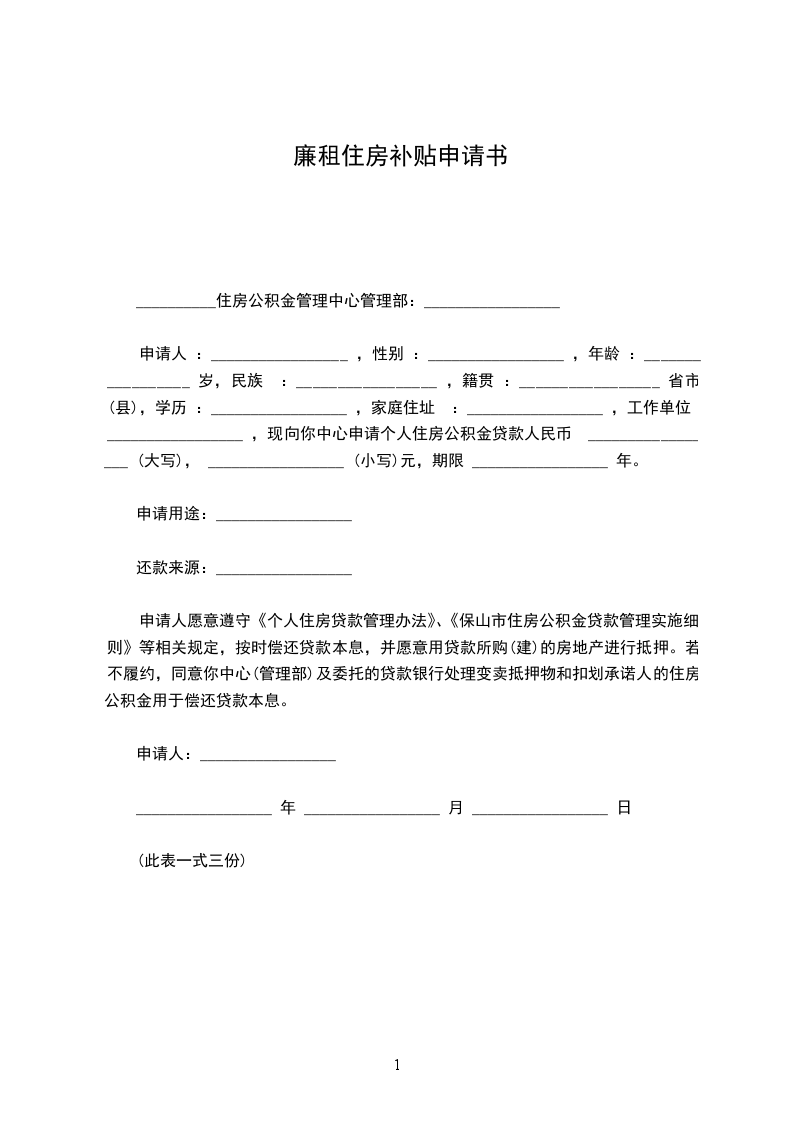 申请人 :_________________ ,性别 :_________________ ,年龄 :_________________ 岁,民族 :_________________ ,籍贯 :_________________ 省市(县),学历 :_________________ ,家庭住址 :_________________ ,工作单位 :_________________ ,现向你中心申请个人住房公积金贷款人民币 _________________ (大写), _________________ (小写)元,期限 _________________ 年。