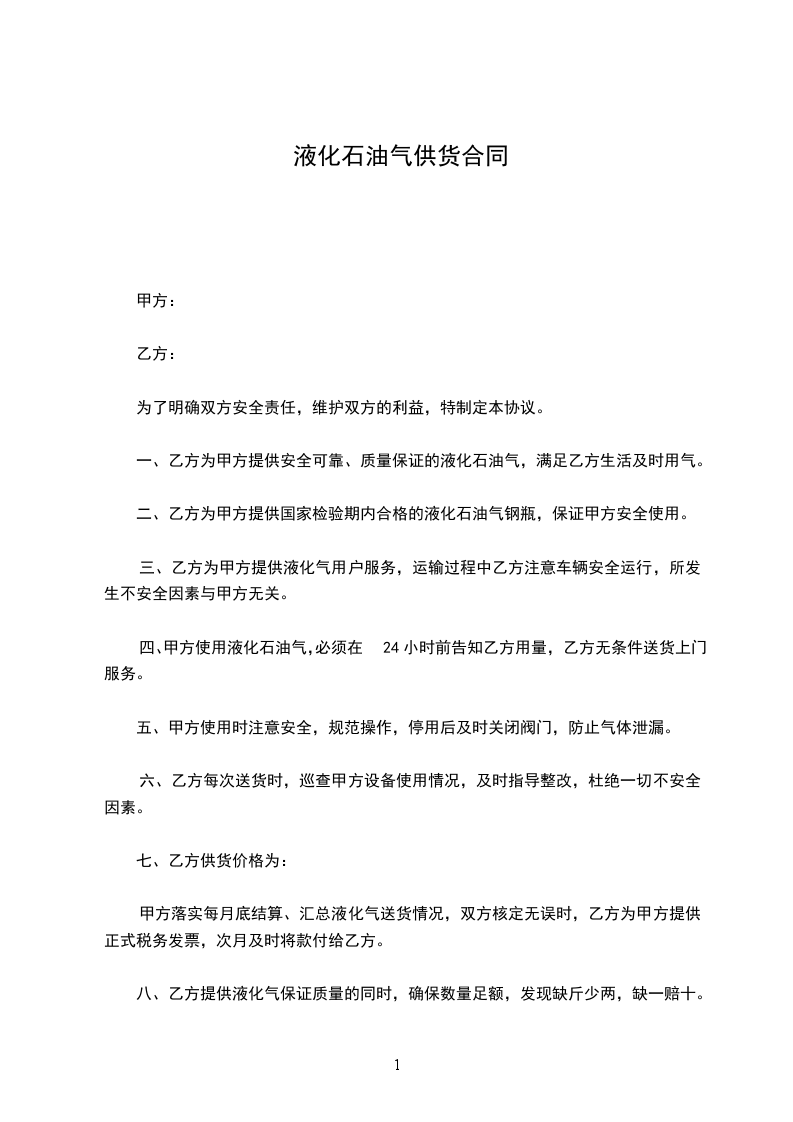 一、乙方为甲方提供安全可靠、质量保证的液化石油气,满足乙方生活及时用气。