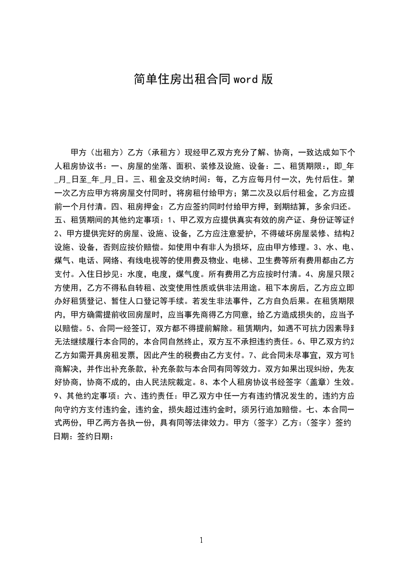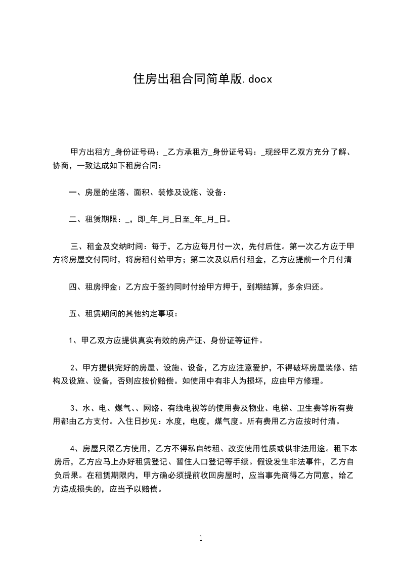 一、甲方将位于__市__街道__小区_号楼____号的房屋出租给乙方居住使用,租赁期限自__年__月__日至__年__月__日,计_个月。