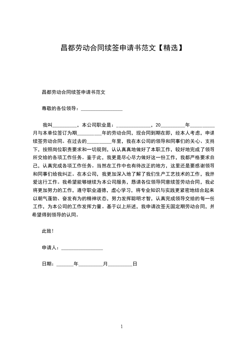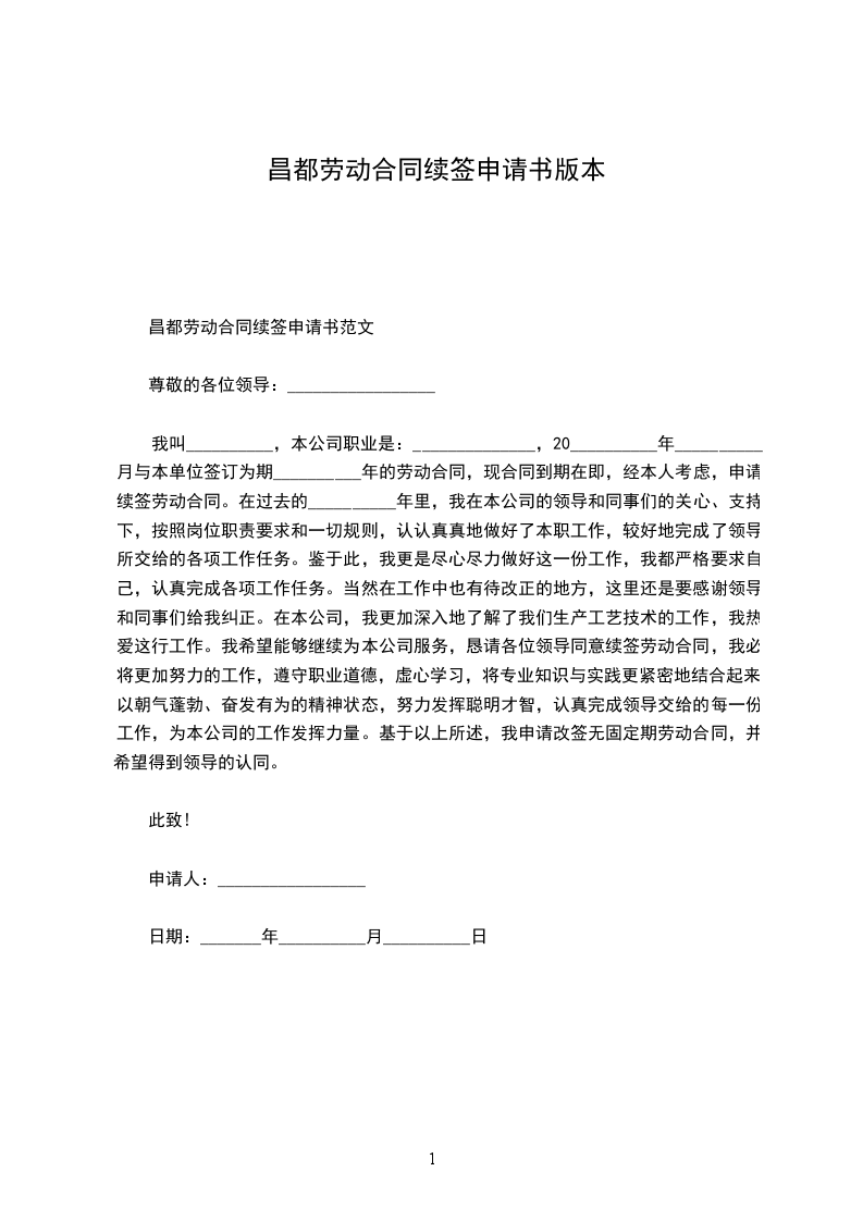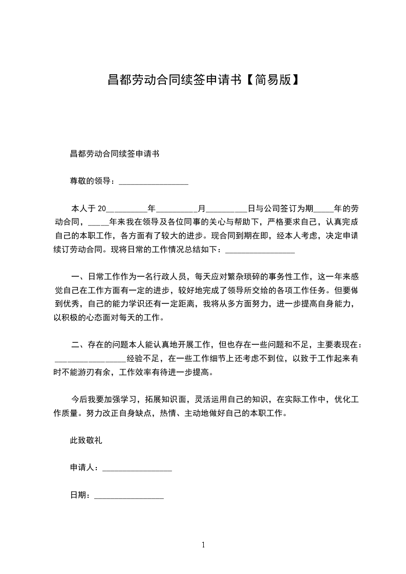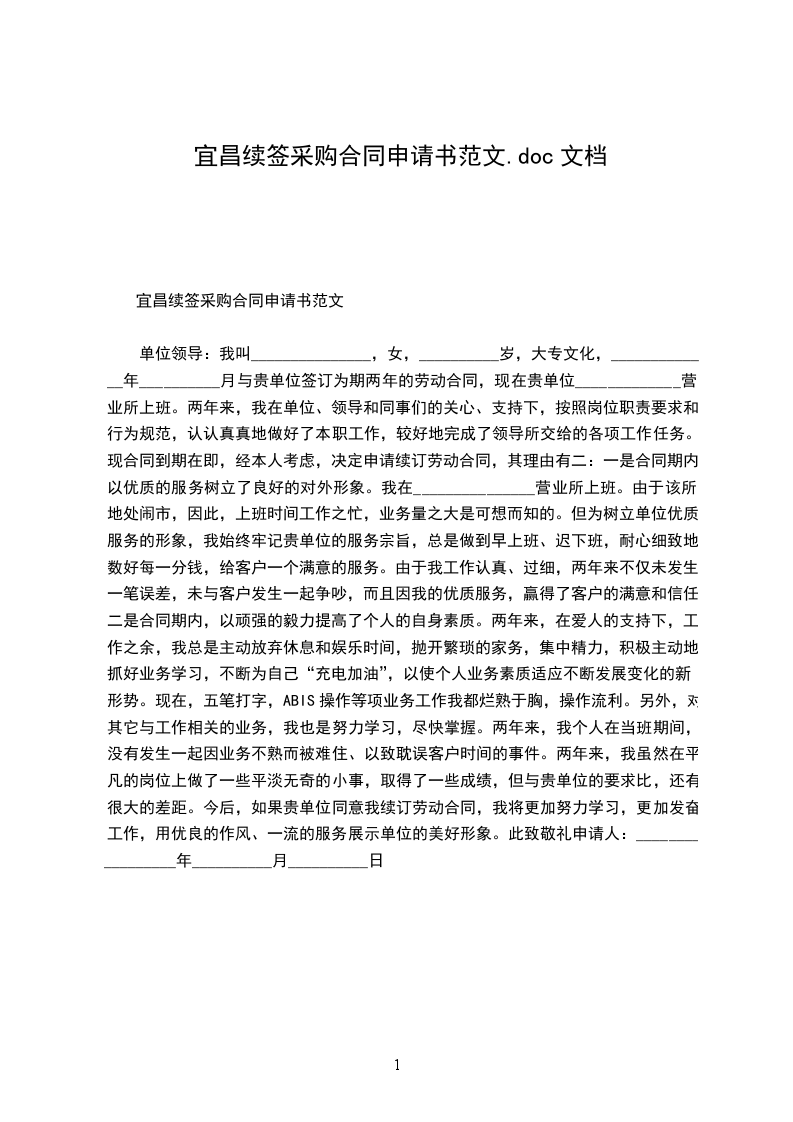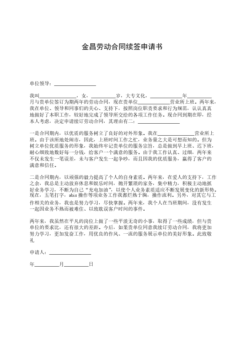 单位领导:_________________ 我叫_______________,女,__________岁,大专文化,_____________年__________月与贵单位签订为期两年的劳动合同,现在贵单位_____________营业所上班。两年来,我在单位、领导和同事们的关心、支持下,按照岗位职责要求和行为规范,认认真真地做好了本职工作,较好地完成了领导所交给的各项工作任务。现合同到期在即,经本人考虑,决定申请续订劳动合同,其理由有二:_________________ 一是合同期内,以优质的服务树立了良好的对外形象。我在_______________营业所上班。由于该所地处闹市,因此,上班时间工作之忙,业务量之大是可想而知的。但为树立单位优质服务的形象,我始终牢记贵单位的服务宗旨,总是做到早上班、迟下班,耐心细致地数好每一分钱,给客户一个满意的服务。由于我工作认真、过细,两年来不仅未发生一笔误差,未与客户发生一起争吵,而且因我的优质服务,赢得了客户的满意和信任。 二是合同期内,以顽强的毅力提高了个人的自身素质。两年来,在爱人的支持下,工作之余,我总是主动放弃休息和娱乐时间,抛开繁琐的家务,集中精力,积极主动地抓好业务学习,不断为自己“充电加油”,以使个人业务素质适应不断发展变化的新形势。现在,五笔打字,abis操作等项业务工作我都烂熟于胸,操作流利。另外,对其它与工作相关的业务,我也是努力学习,尽快掌握。两年来,我个人在当班期间,没有发生一起因业务不熟而被难住、以致耽误客户时间的事件。 两年来,我虽然在平凡的岗位上做了一些平淡无奇的小事,取得了一些成绩,但与贵单位的要求比,还有很大的差距。今后,如果贵单位同意我续订劳动合同,我将更加努力学习,更加发奋工作,用优良的作风、一流的服务展示单位的美好形象。此致敬礼 申请人:_________________ 年__________月__________日