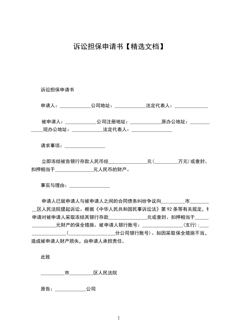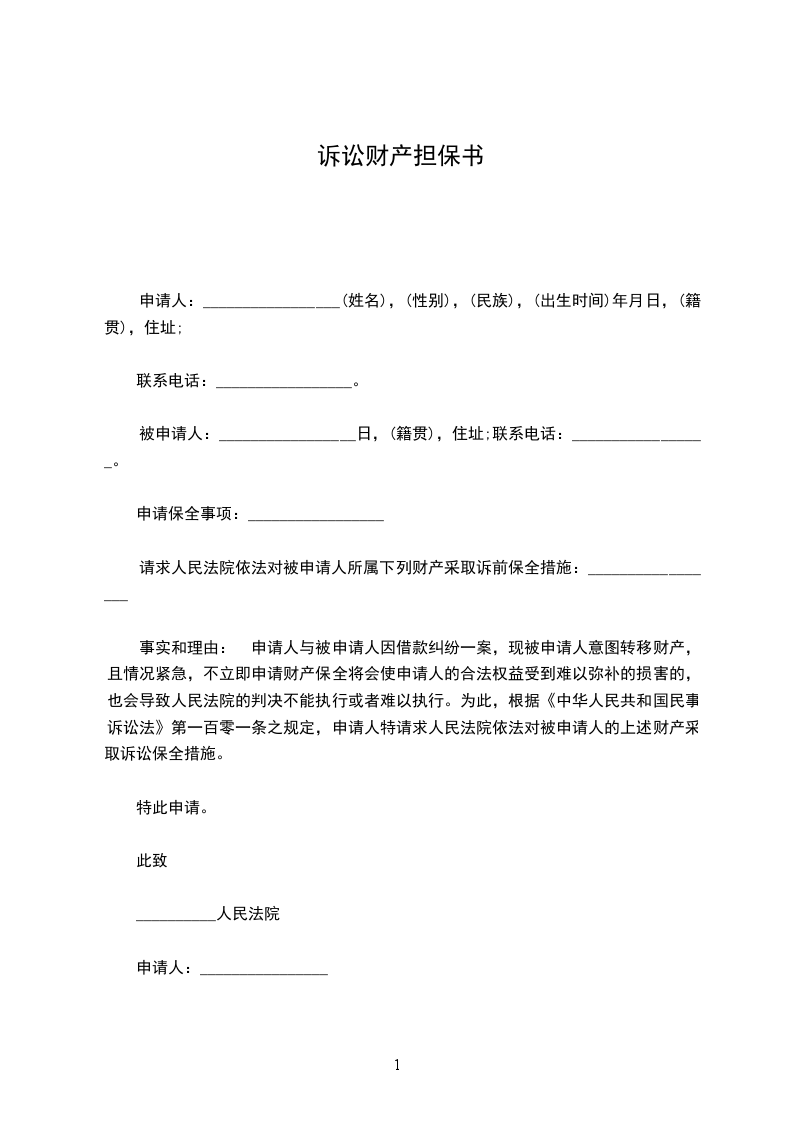 申请人:_________________有限公司地址:___________________________电话:_________________ 被申请人:_________________有限公司地址:________________________________电话:_____________ 申请人诉被申请人___________有限公司买卖合同纠纷一案,为了维护申请人的合法权益,确保本案的顺利审理和执行,根据《中华人民共和国民事诉讼法》第92条、第96条的规定,申请人特提出财产保全申请,请求查封、冻结被申请人价值人民币___________元的财产,申请人对上述申请愿意承担由此而引起的法律责任。 此致 ______人民法院 申请人:_________________ _____年_____月_____日 报申请人可供保全的财产有:_________________