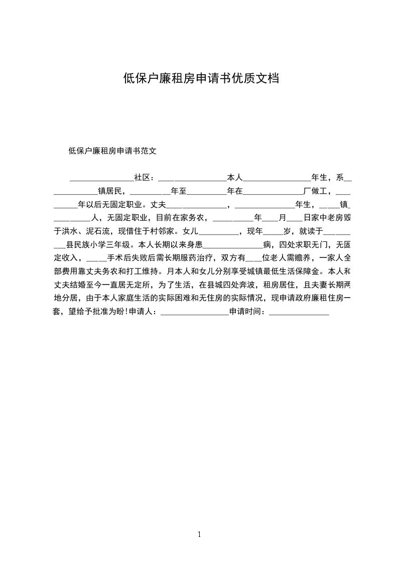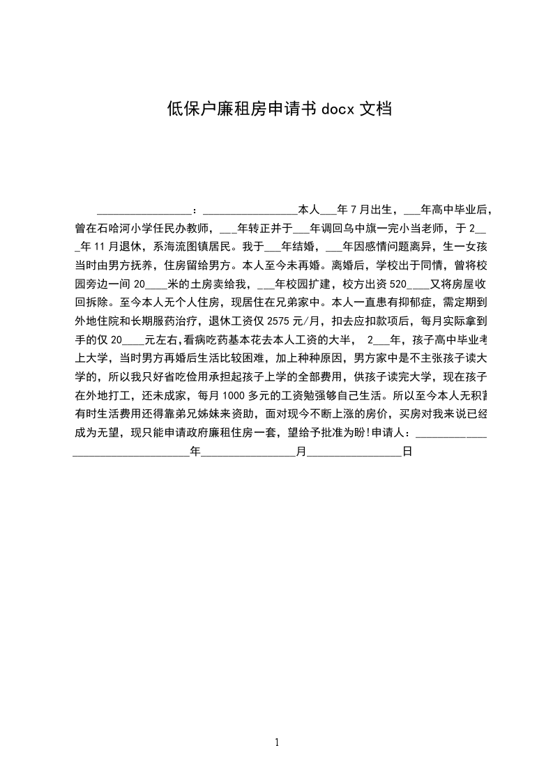 __________县人民政府、北街社区: 申请人:______________,女,汉族,现年47岁,现租住在__________县环城西路_______________号。 申请原因及理由: 工厂职工,因该厂破产倒闭于20__________年下岗至今无事可做。同时解除了劳动合同。 下岗后既无国家的收入和其他经济来源,更无经济购买住房,为了生存,现外出打工维持生活,又丢不下小小年纪的女儿。儿子也没有工作,在家待业,想在本城找工作又难找到适合我们的工作,所以致使经济和生活十分困难。 上班时单位已交养老保险,但下岗后没有交养老保险,连生活都成问题,所以交不起养老保险金。 为此,根据现在特殊情况和实际问题,恳求政府解决廉租房补贴,渡过住房难关为谢! 此致 申请人:______________ _____年_____月_____日