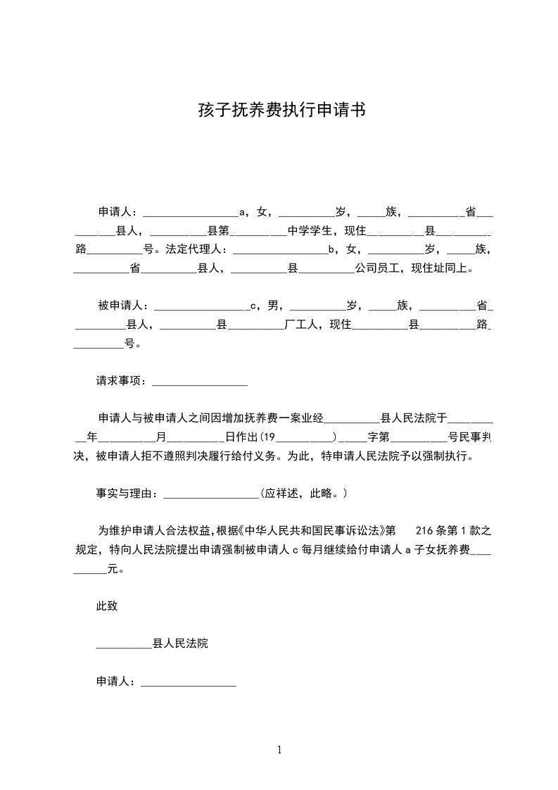 最新小孩抚养费执行申请书