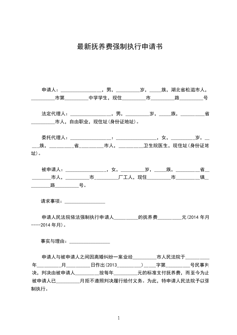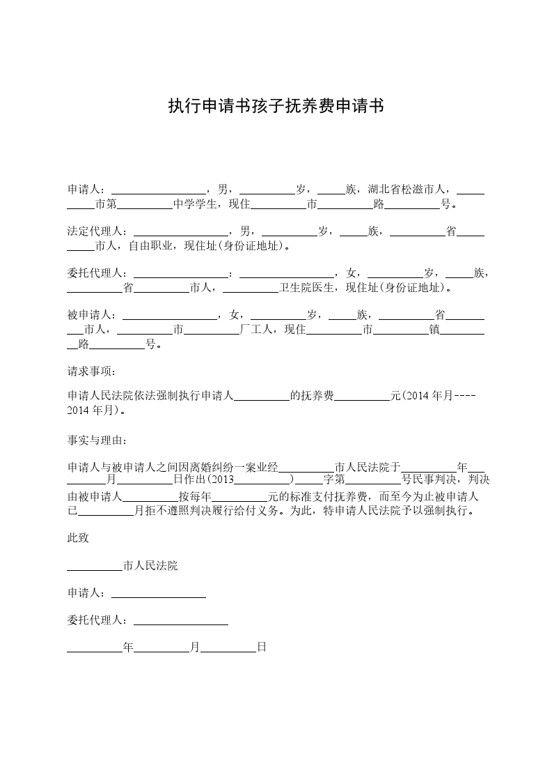 申请人:_________________,男,__________岁,_____族,湖北省松滋市人,__________市第__________中学学生,现住__________市__________路__________号。 法定代理人:_________________,男,__________岁,_____族,__________省__________市人,自由职业,现住址(身份证地址)。 委托代理人:_________________:_________________,女,__________岁,_____族,__________省__________市人,__________卫生院医生,现住址(身份证地址)。 被申请人:_________________,女,__________岁,_____族,__________省__________市人,__________市__________厂工人,现住__________市__________镇__________路__________号。 请求事项: 申请人民法院依法强制执行申请人__________的抚养费__________元(2024年月----2024年月)。 事实与理由: 申请人与被申请人之间因离婚纠纷一案业经__________市人民法院于__________年__________月__________日作出(2024__________)_____字第__________号民事判决,判决由被申请人__________按每年__________元的标准支付抚养费,而至今为止被申请人已__________月拒不遵照判决履行给付义务。为此,特申请人民法院予以强制执行。 此致 __________市人民法院 申请人:_________________ 委托代理人:_________________ __________年__________月__________日