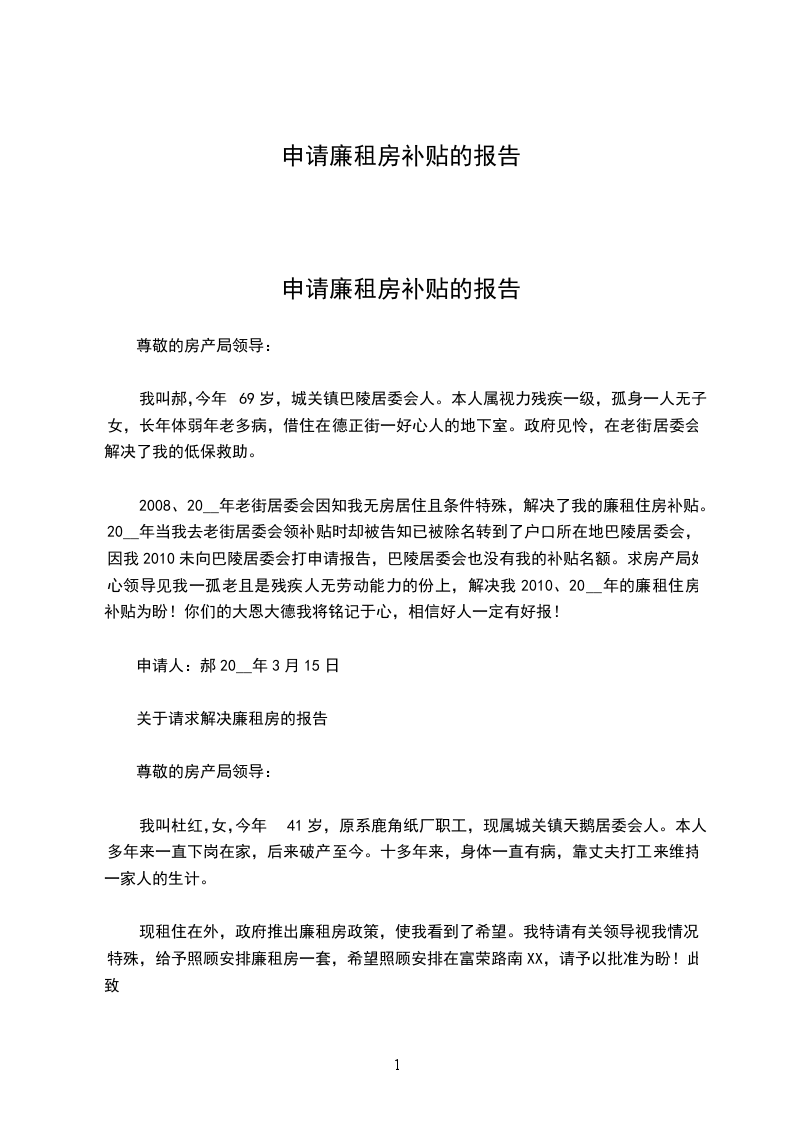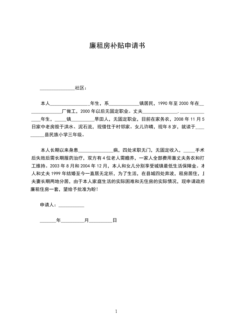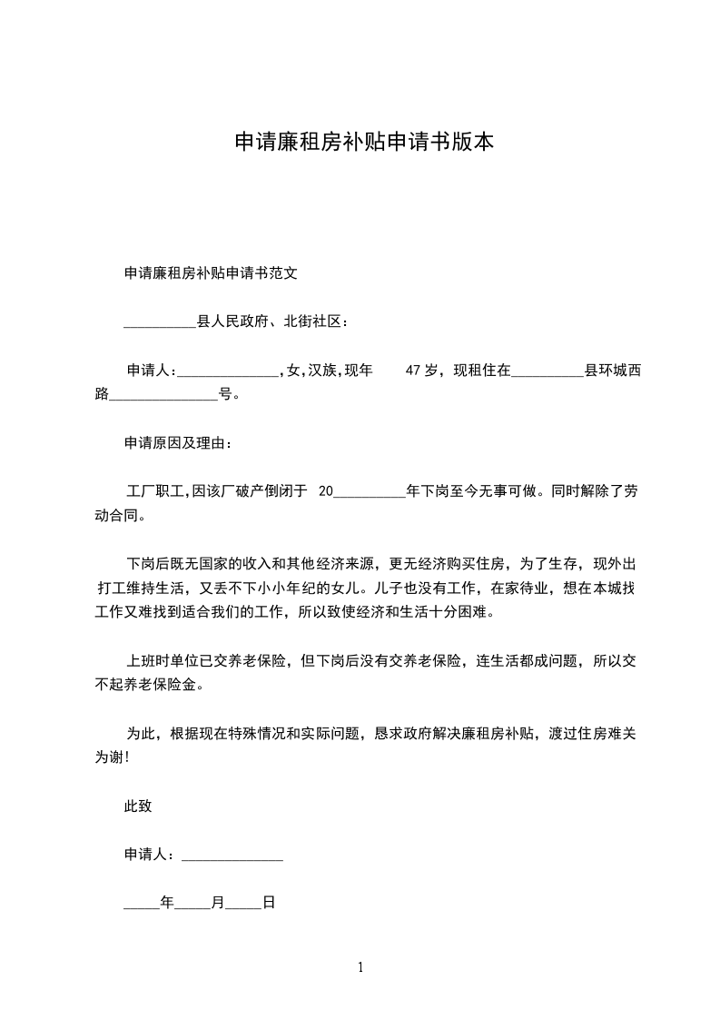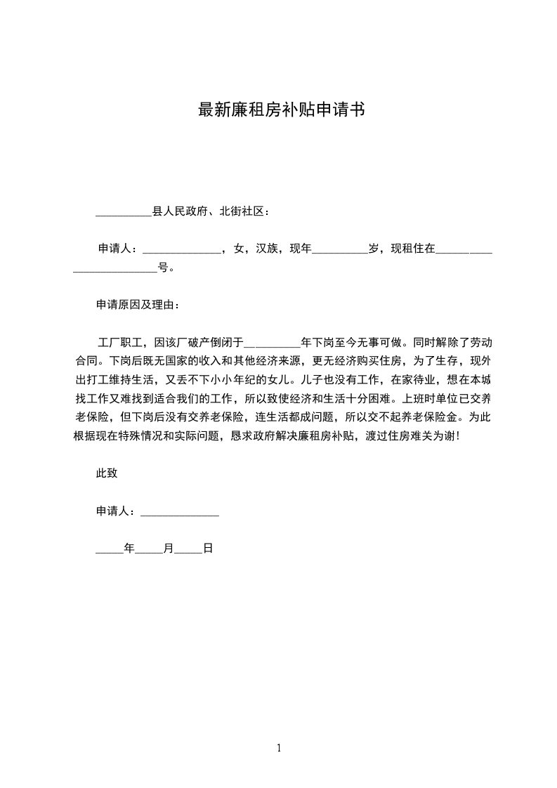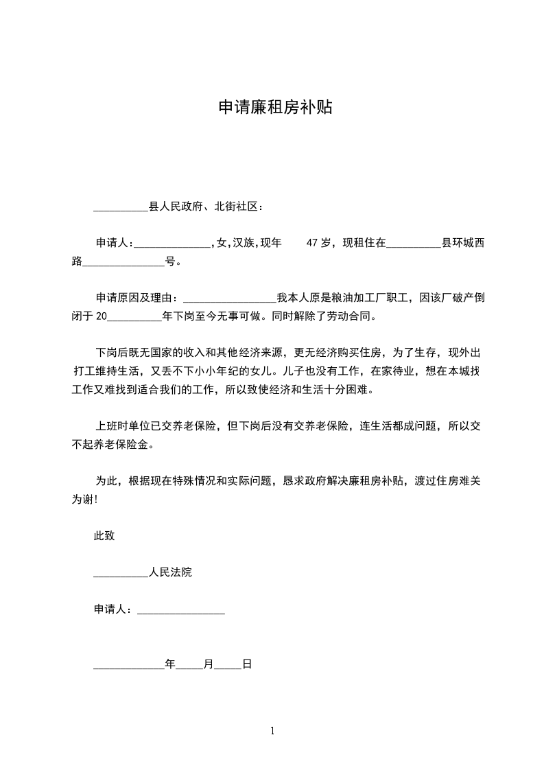 __________县人民政府、北街社区: 申请人:______________,女,汉族,现年47岁,现租住在__________县环城西路_______________号。 申请原因及理由: 工厂职工,因该厂破产倒闭于20__________年下岗至今无事可做。同时解除了劳动合同。 下岗后既无国家的收入和其他经济来源,更无经济购买住房,为了生存,现外出打工维持生活,又丢不下小小年纪的女儿。儿子也没有工作,在家待业,想在本城找工作又难找到适合我们的工作,所以致使经济和生活十分困难。 上班时单位已交养老保险,但下岗后没有交养老保险,连生活都成问题,所以交不起养老保险金。 为此,根据现在特殊情况和实际问题,恳求政府解决廉租房补贴,渡过住房难关为谢! 此致 申请人:______________ _____年_____月_____日