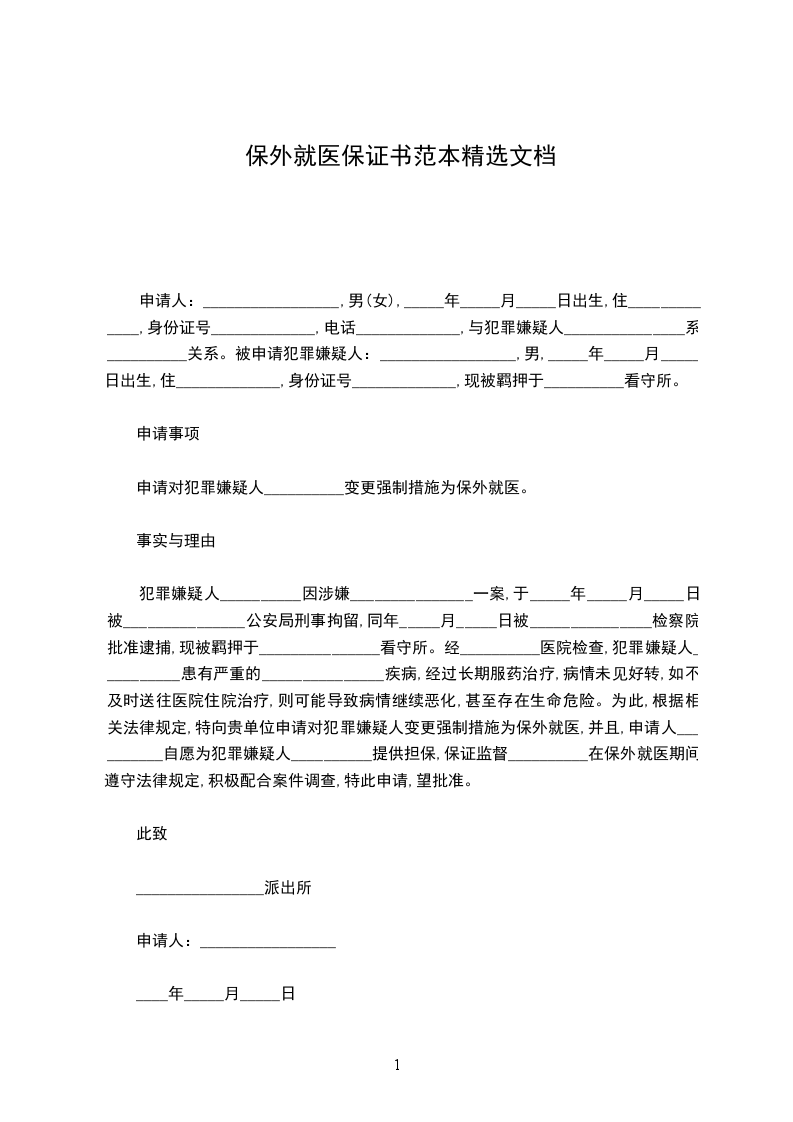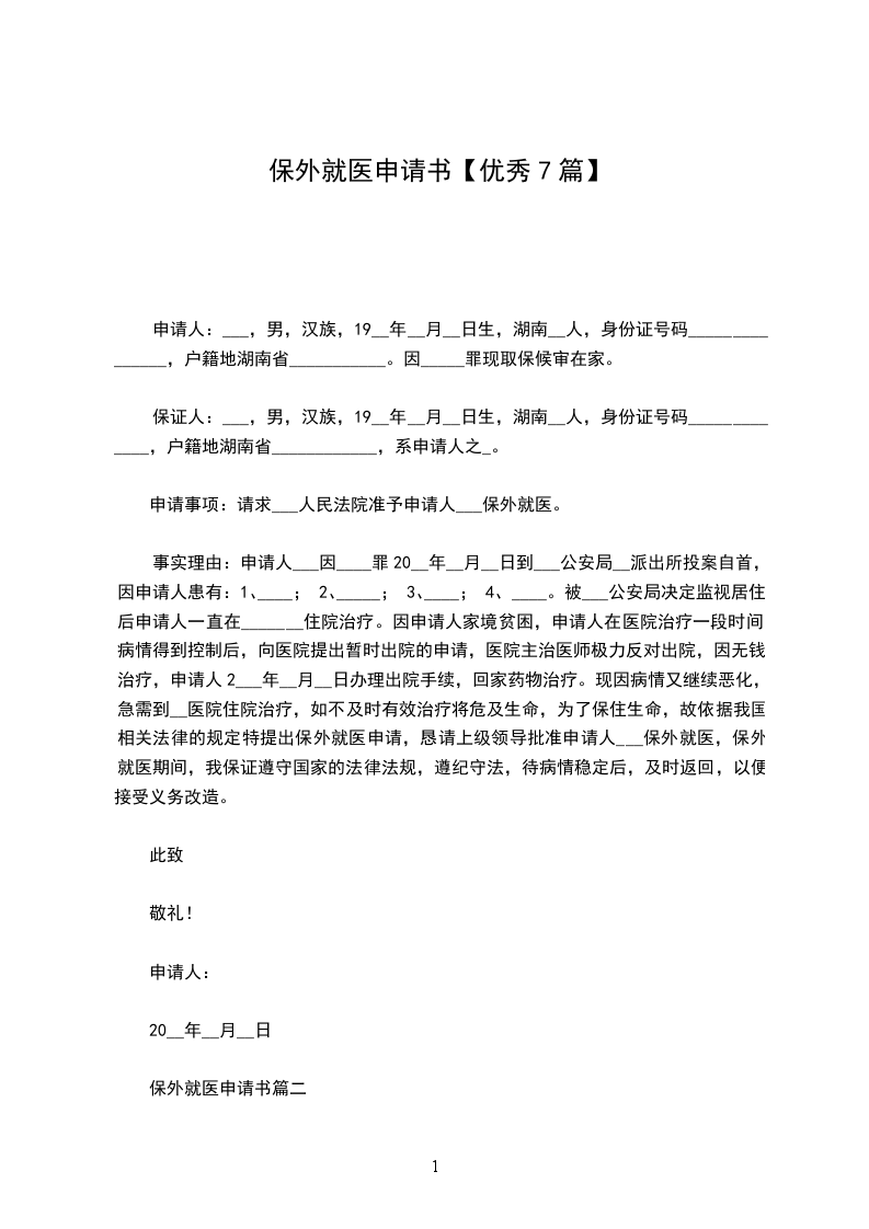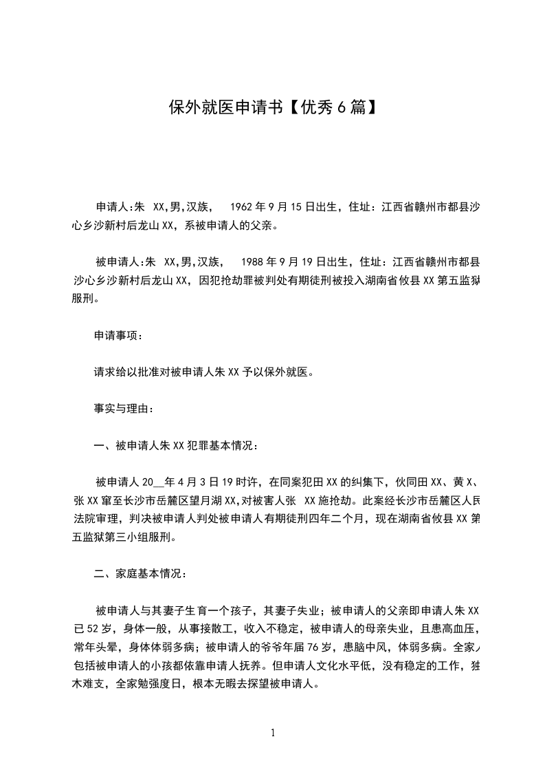 我是_______________(申请人)姓名,的因________________(罪名)被判处__________刑_____年,现因_______________(病名或原因),根据《中华人民共和国刑事诉讼法》相关规定,特申请保外就医。