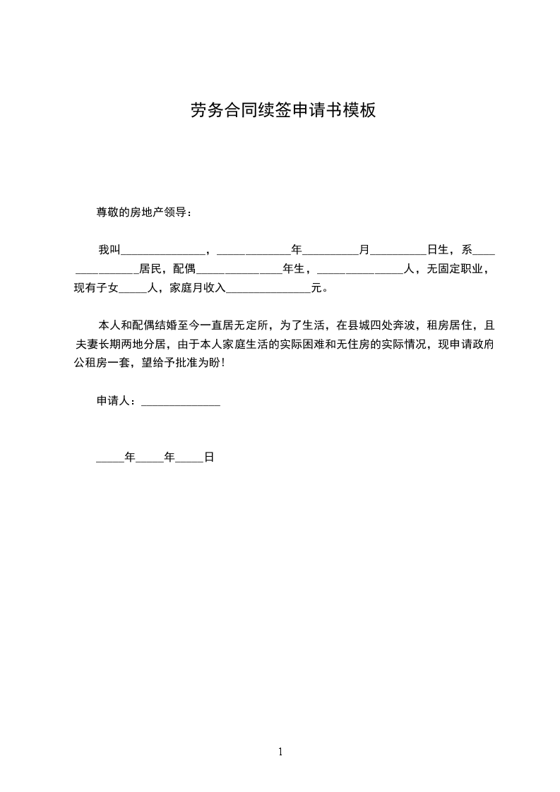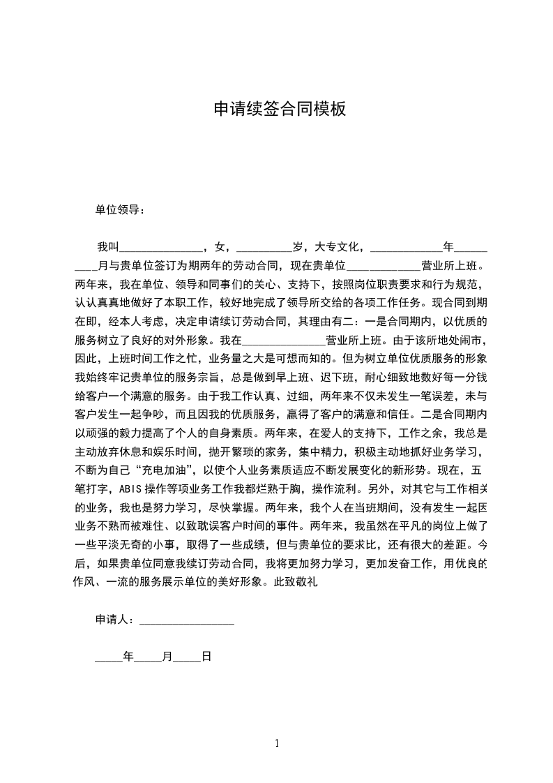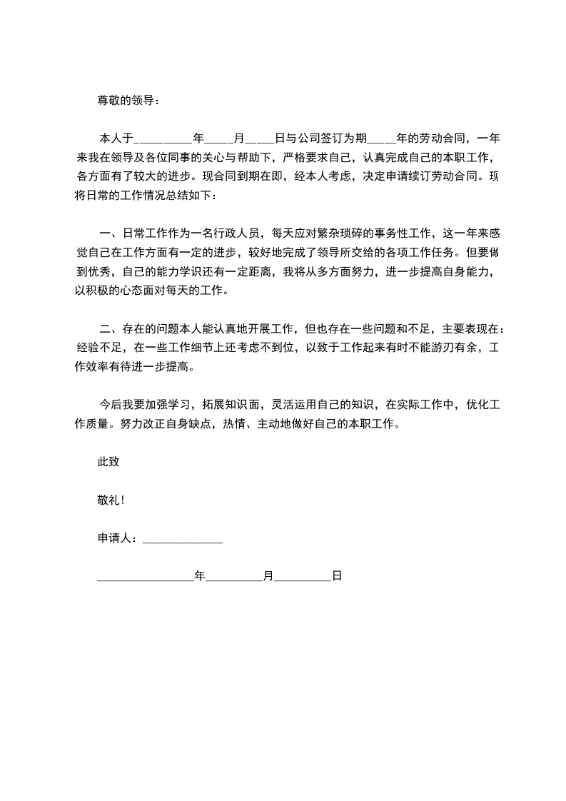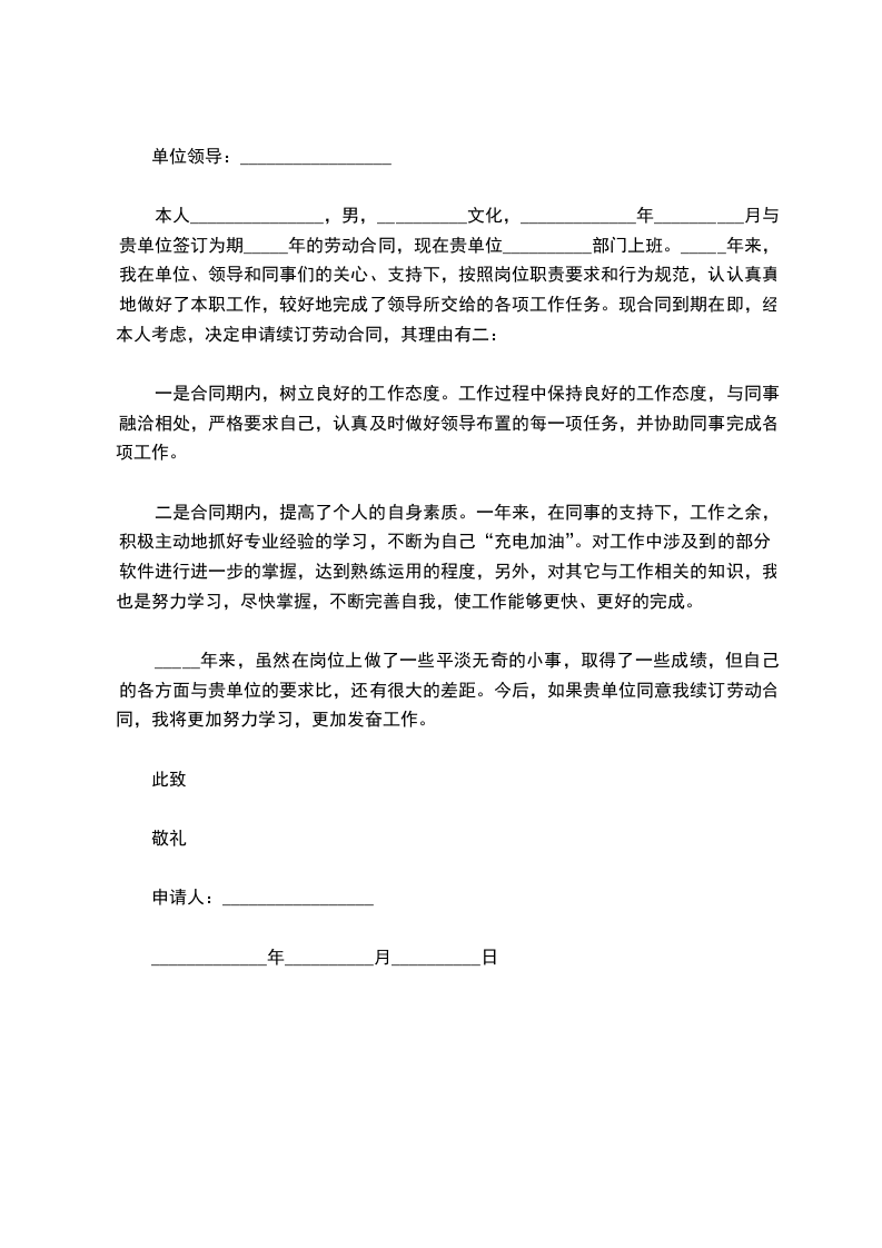 本人_______________,男,__________文化,_____________年__________月与贵单位签订为期_____年的劳动合同,现在贵单位__________部门上班。_____年来,我在单位、领导和同事们的关心、支持下,按照岗位职责要求和行为规范,认认真真地做好了本职工作,较好地完成了领导所交给的各项工作任务。现合同到期在即,经本人考虑,决定申请续订劳动合同,其理由有二: