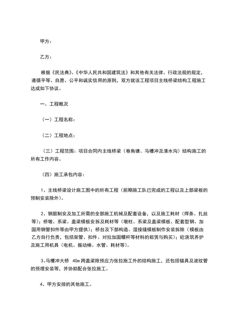 根据《民法典》、《中华人民共和国建筑法》和其他有关法律、行政法规的规定,遵循平等、自愿、公平和诚实信用的原则,双方就该工程项目主线桥梁结构工程施工达成如下协议。