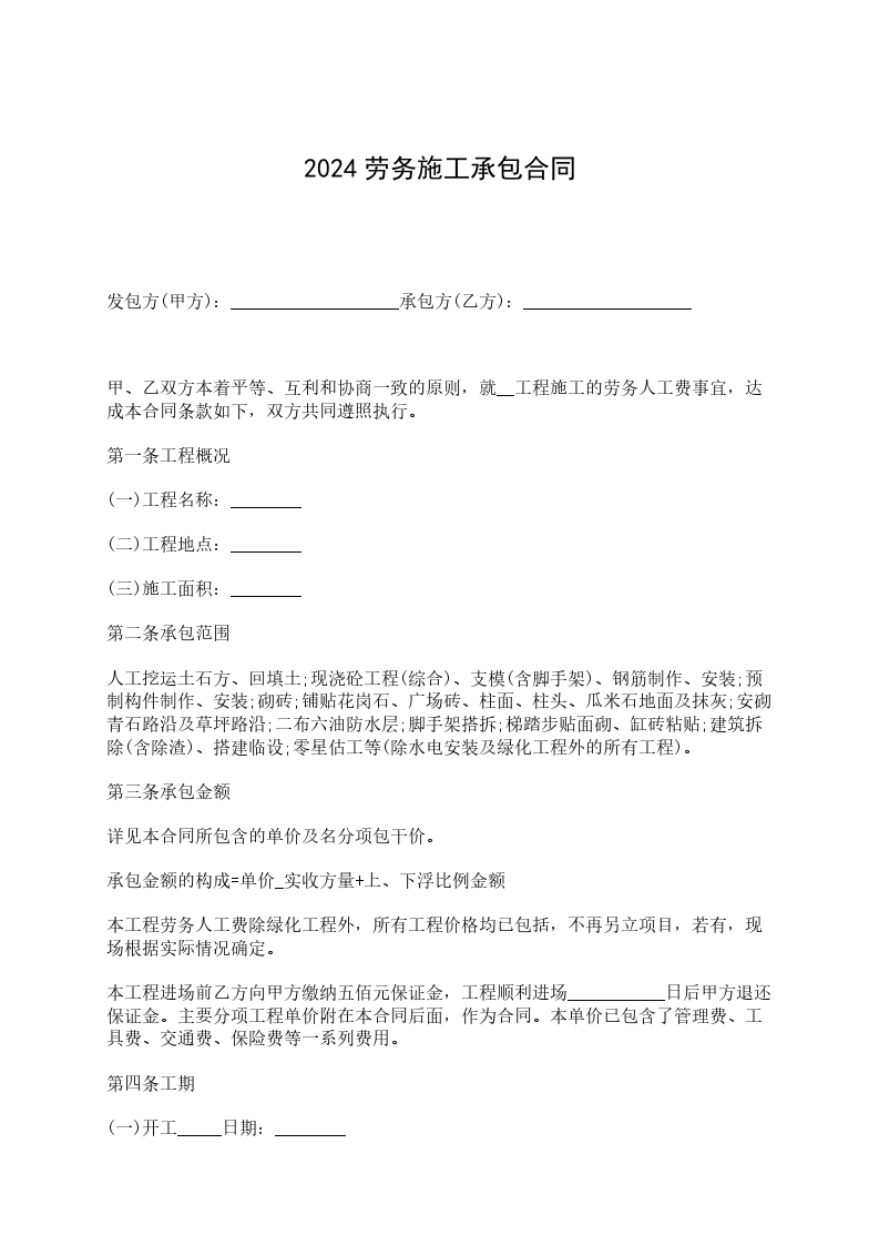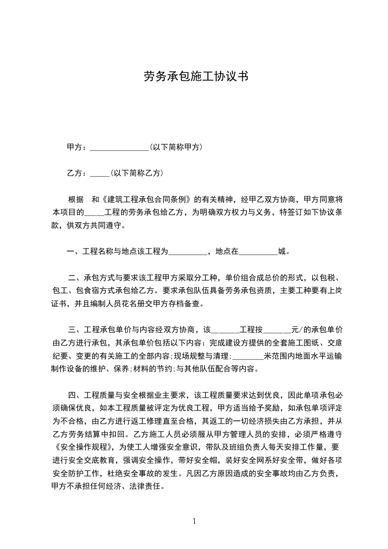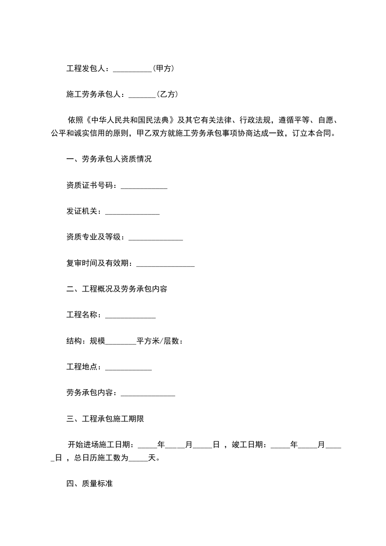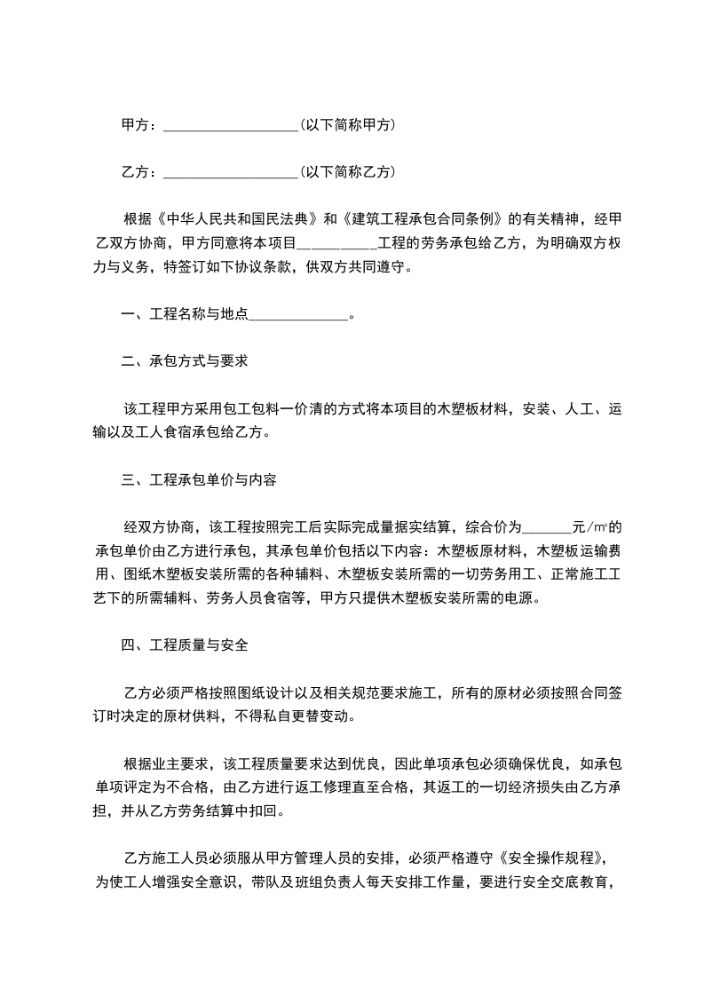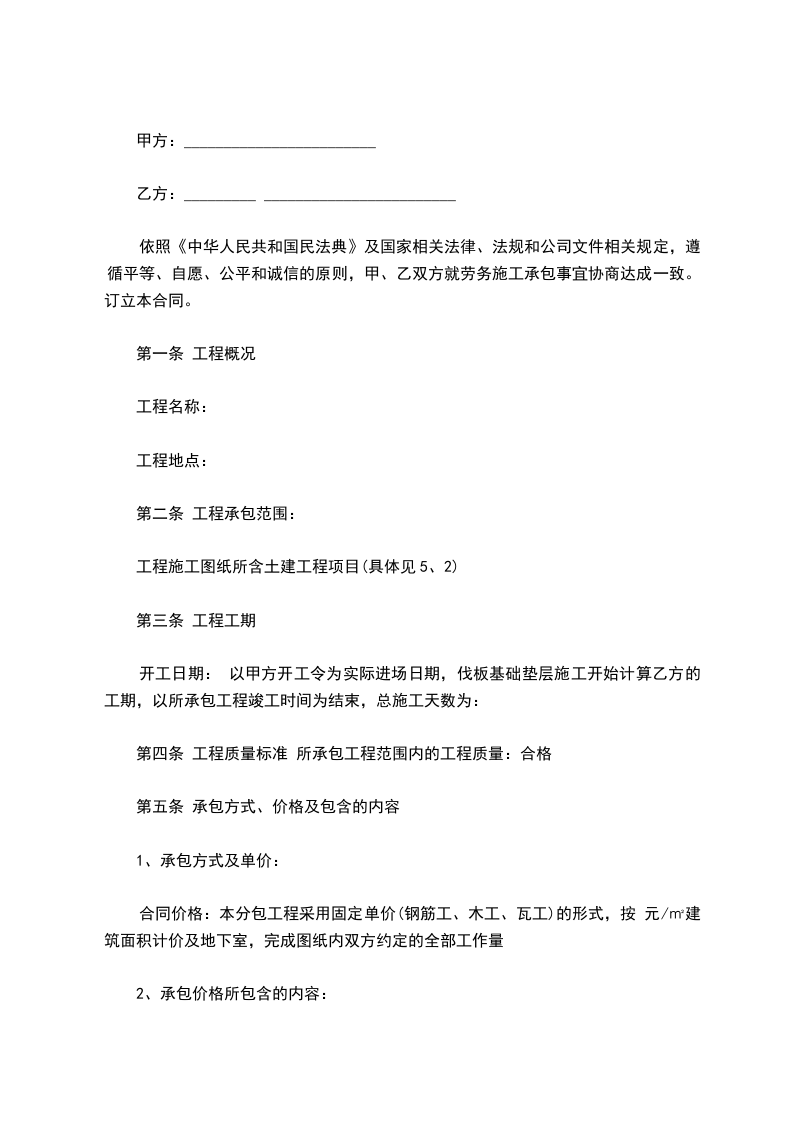 1、劳务施工承包,包质量、包工期、包安全、包设备、包模板等。