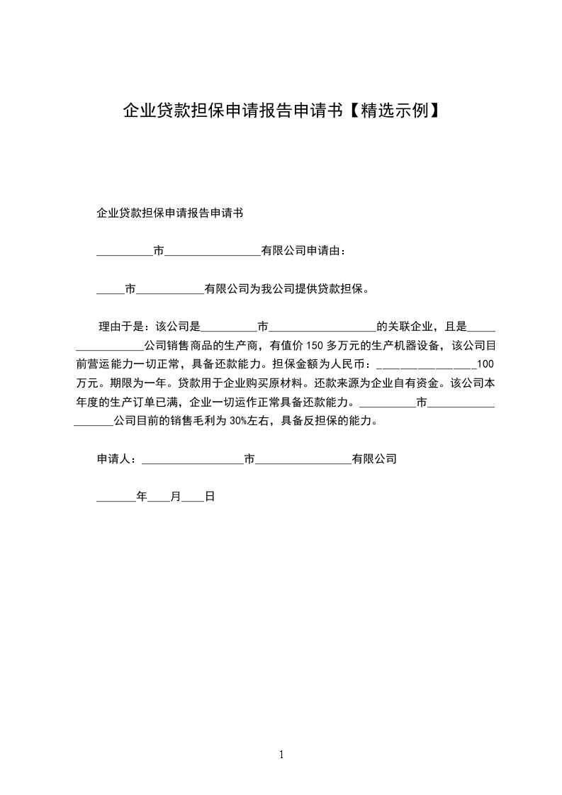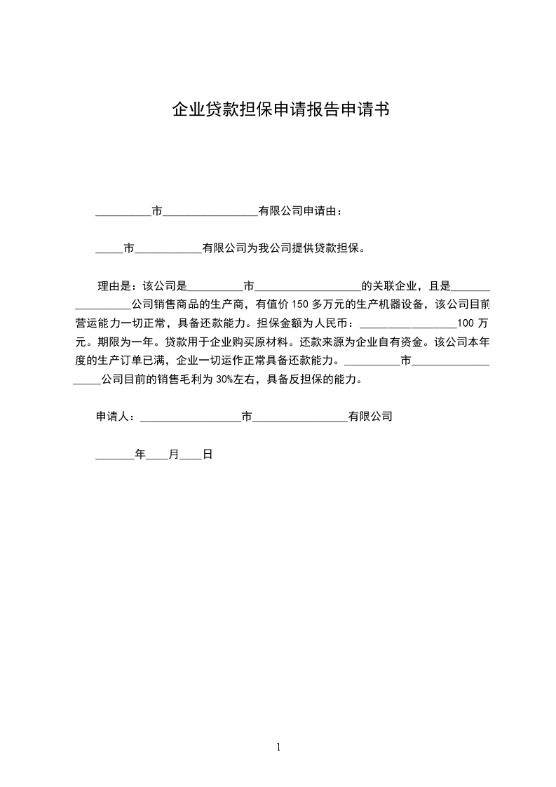理由是:该公司是__________市___________________的关联企业,且是_________________公司销售商品的生产商,有值价150多万元的生产机器设备,该公司目前营运能力一切正常,具备还款能力。担保金额为人民币:_________________100万元。期限为一年。贷款用于企业购买原材料。还款来源为企业自有资金。该公司本年度的生产订单已满,企业一切运作正常具备还款能力。__________市___________________公司目前的销售毛利为30%左右,具备反担保的能力。