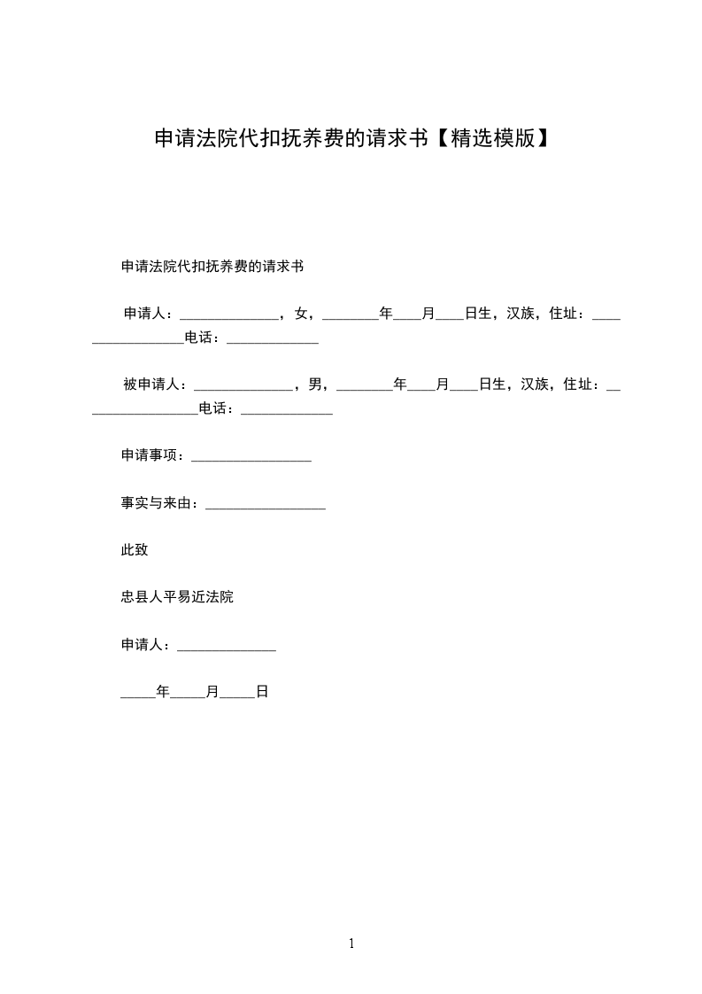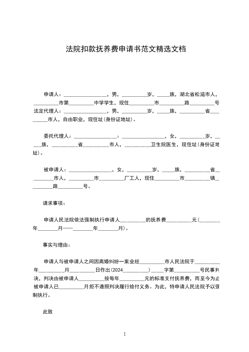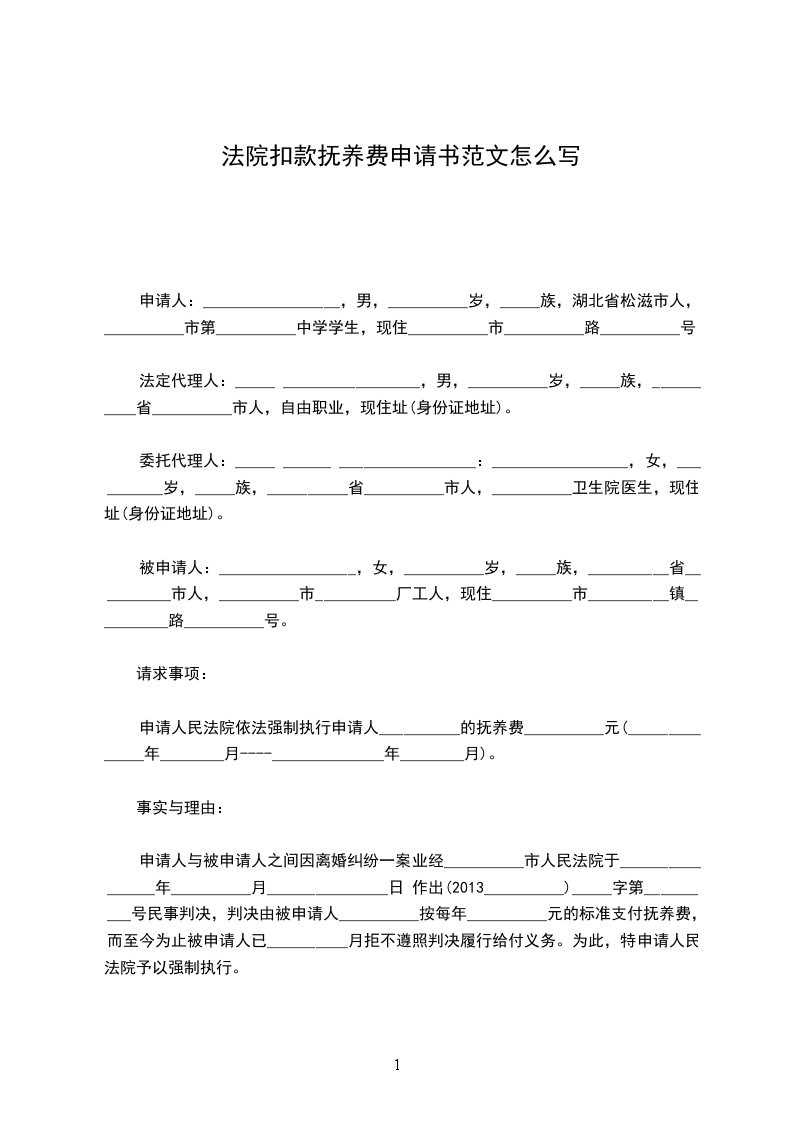 你好,根据您的需求,为你提供了法院扣款抚养费申请书范本:_________________申请人:_________________a,女,__________岁,_____族,__________省__________县人,__________县第__________中学学生,现住__________县__________路__________号。法定代理人:_________________b,女,__________岁,_____族,__________省__________县人,__________县__________公司员工,现住址同上。 被申请人:_________________c,男,__________岁,_____族,__________省__________县人,__________县__________厂工人,现住__________县__________路__________号。 请求事项:_________________ 申请人与被申请人之间因增加抚养费一案业经__________县人民法院于__________年__________月__________日作出(19__________)_____字第__________号民事判决,被申请人拒不遵照判决履行给付义务。为此,特申请人民法院予以强制执行。 事实与理由:_________________(应祥述,此略。) 为维护申请人合法权益,根据《中华人民共和国民事诉讼法》第216条第1款之规定,特向人民法院提出申请强制被申请人c每月继续给付申请人a子女抚养费__________元。 此致 __________县人民法院