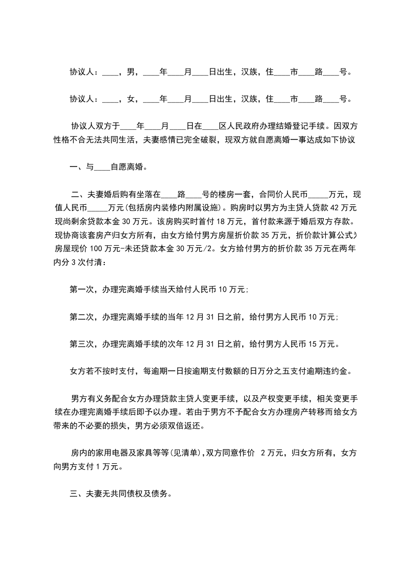 二、夫妻婚后购有坐落在____路____号的楼房一套,合同价人民币_____万元,现值人民币_____万元(包括房内装修内附属设施)。购房时以男方为主贷人贷款42万元,现尚剩余贷款本金30万元。该房购买时首付18万元,首付款来源于婚后双方存款。现协商该套房产归女方所有,由女方给付男方房屋折价款35万元,折价款计算公式为:房屋现价100万元-未还贷款本金30万元/2。女方给付男方的折价款35万元在两年内分3次付清: