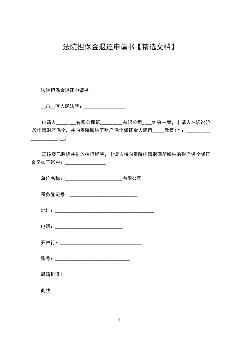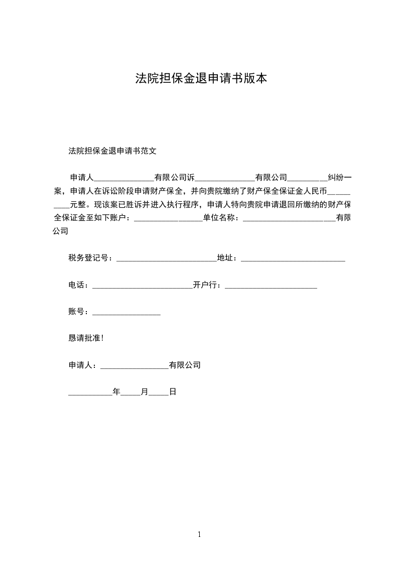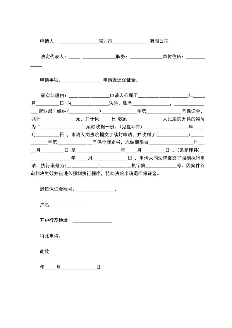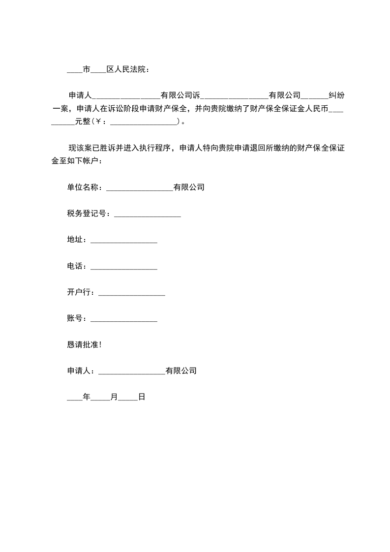 现该案已胜诉并进入执行程序,申请人特向贵院申请退回所缴纳的财产保全保证金至如下账户:_________________
