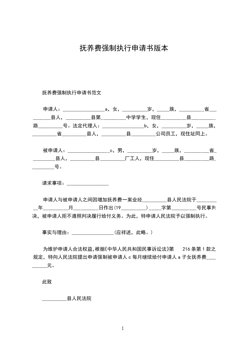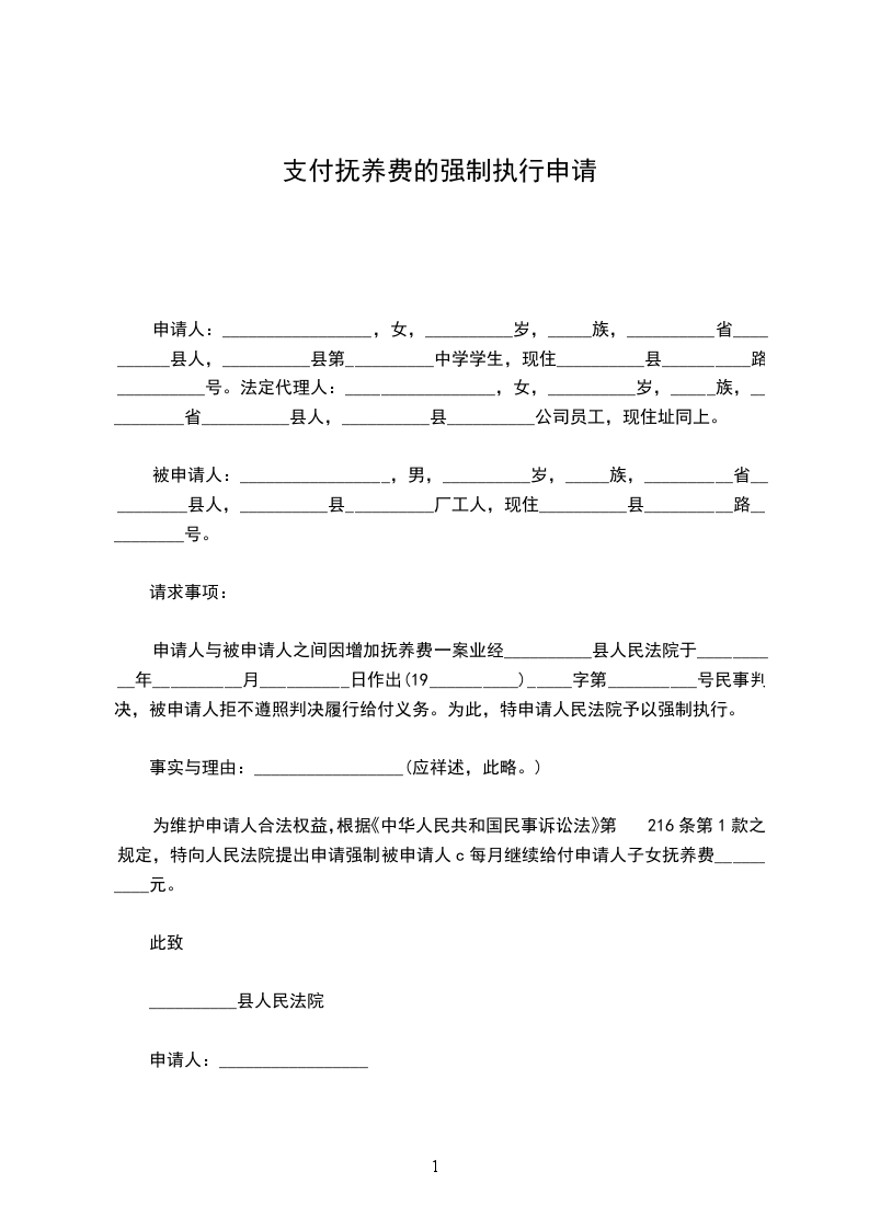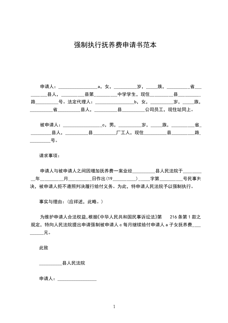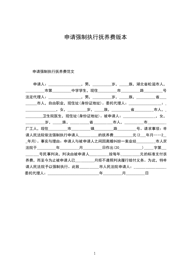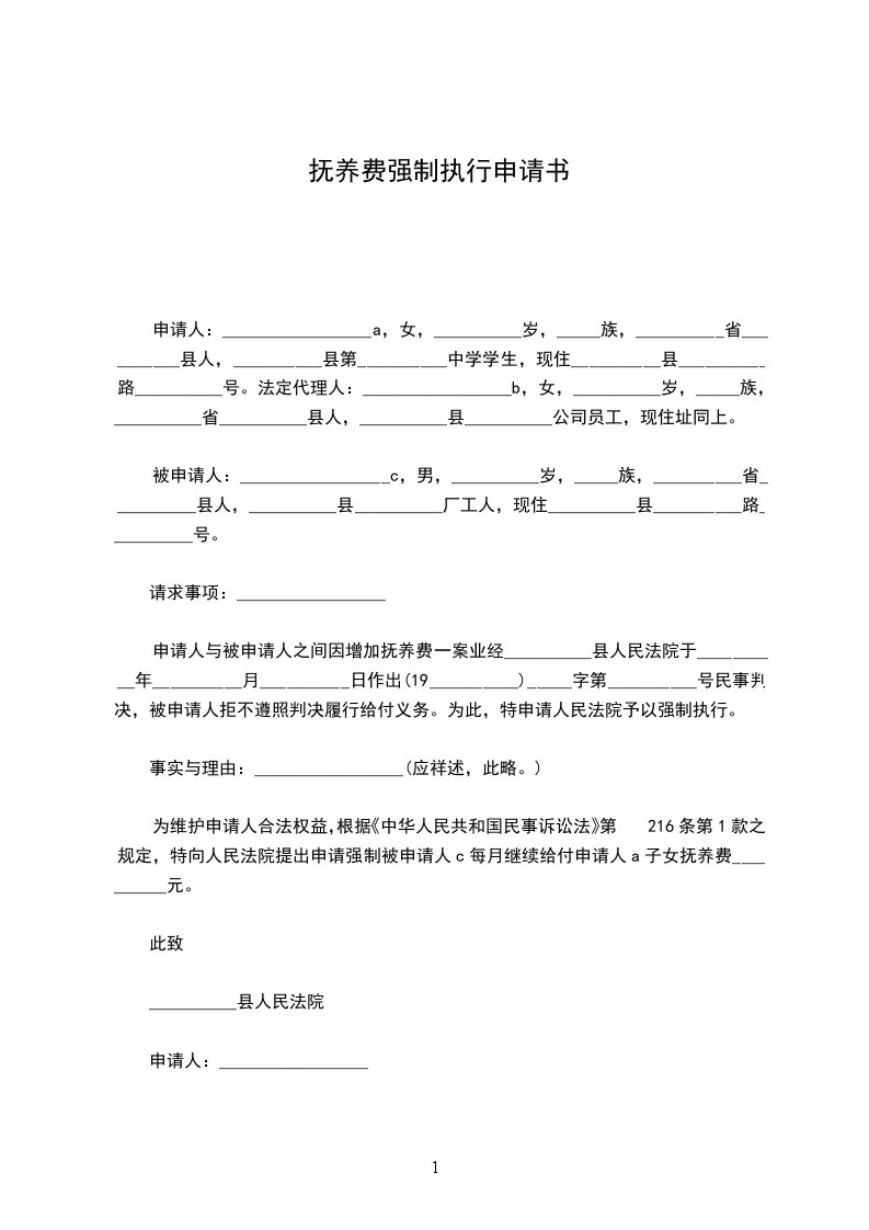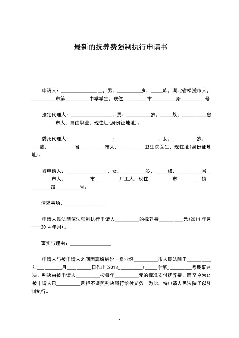 申请人民法院依法强制执行申请人__________的抚养费__________元(2024年月----2024年月)。