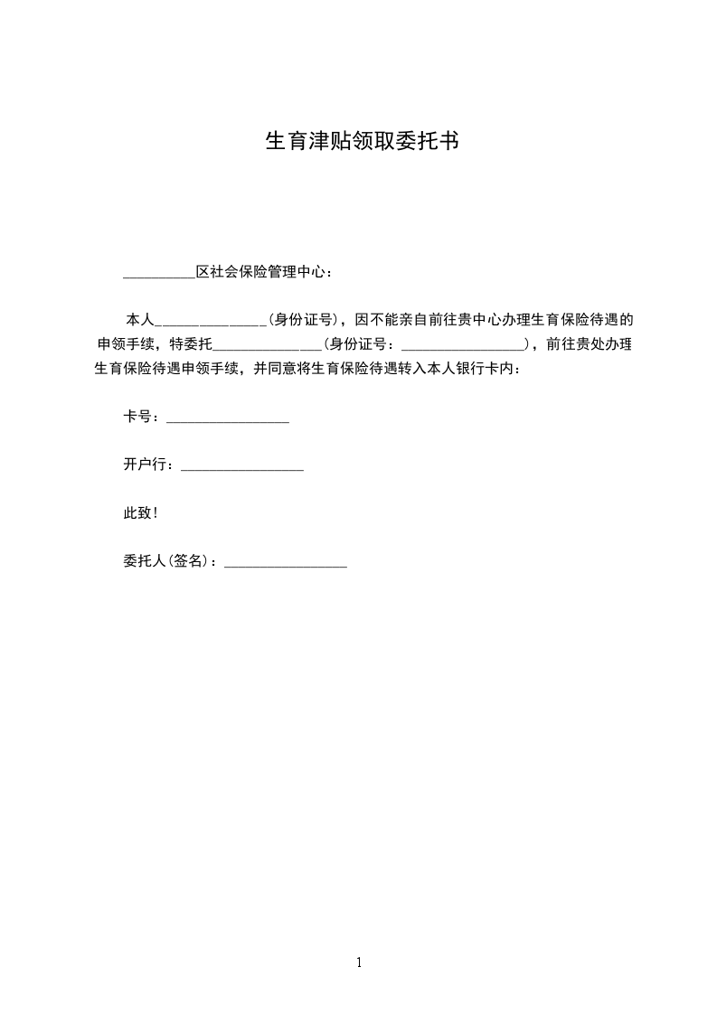 本人_______________(身份证号),因不能亲自前往贵中心办理生育保险待遇的申领手续,特委托_______________(身份证号:_________________),前往贵处办理生育保险待遇申领手续,并同意将生育保险待遇转入本人银行卡内: