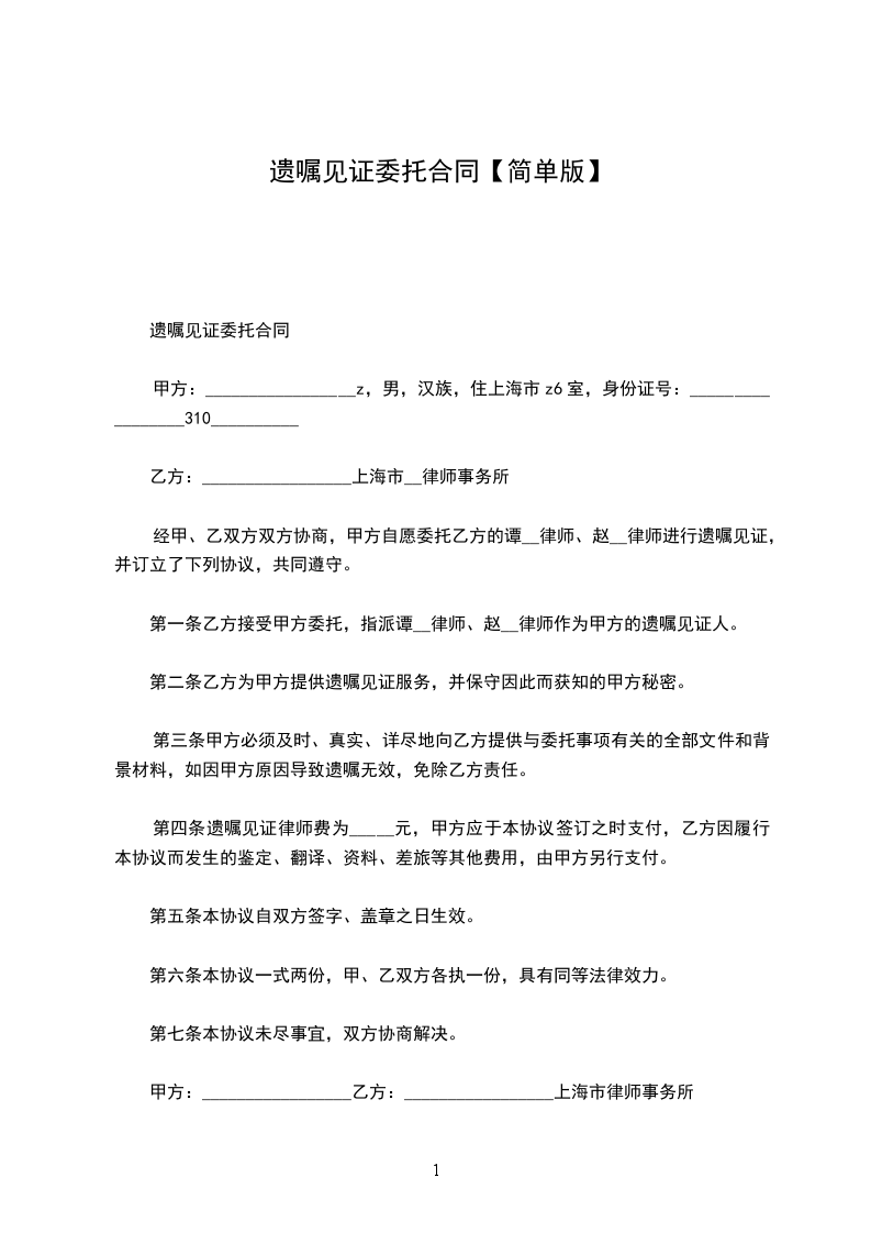 甲方:_________________,男,汉族,住___________,身份证号:_________________ 乙方:_________________律师事务所 经甲、乙双方双方协商,甲方自愿委托乙方的________律师、________律师进行遗嘱见证,并订立了下列协议,共同遵守。 第一条乙方接受甲方委托,指派谭______律师、赵______律师作为甲方的遗嘱见证人。 第二条乙方为甲方提供遗嘱见证服务,并保守因此而获知的甲方秘密。 第三条甲方必须及时、真实、详尽地向乙方提供与委托事项有关的全部文件和背景材料,如因甲方原因导致遗嘱无效,免除乙方责任。 第四条遗嘱见证律师费为______元,甲方应于本协议签订之时支付,乙方因履行本协议而发生的鉴定、翻译、资料、差旅等其他费用,由甲方另行支付。 第五条本协议自双方签字、盖章之日生效。 第六条本协议一式两份,甲、乙双方各执一份,具有同等法律效力。 第七条本协议未尽事宜,双方协商解决。 甲方:_________________乙方:_________________律师事务所 _____年_____月_____日_____年_____月_____日