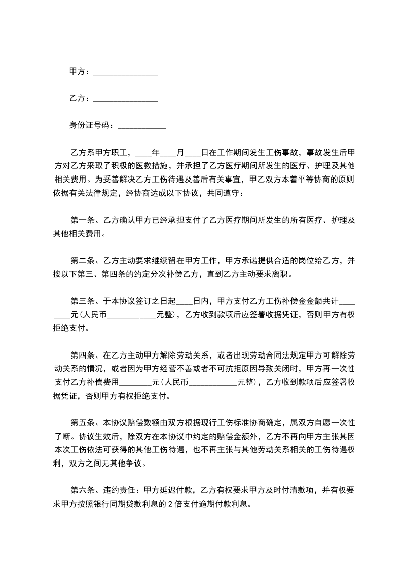 第五条、本协议赔偿数额由双方根据现行工伤标准协商确定,属双方自愿一次性了断。协议生效后,除双方在本协议中约定的赔偿金额外,乙方不再向甲方主张其因本次工伤依法可获得的其他工伤待遇,也不再主张与其他劳动关系相关的工伤待遇权利,双方之间无其他争议。