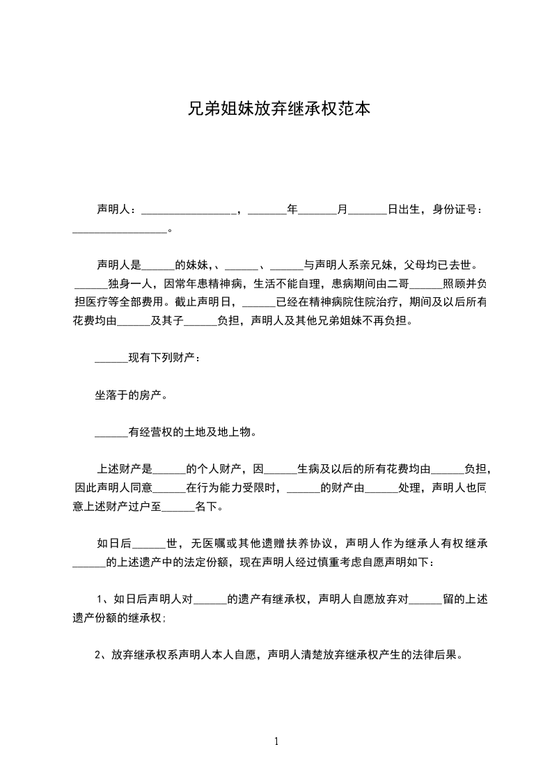 声明人是 ______ 的妹妹,、 ______ 、 ______与声明人系亲兄妹,父母均已去世。 ______ 独身一人,因常年患精神病,生活不能自理,患病期间由二哥 ______ 照顾并负担医疗等全部费用。截止声明日, ______ 已经在精神病院住院治疗,期间及以后所有花费均由 ______ 及其子 ______ 负担,声明人及其他兄弟姐妹不再负担。