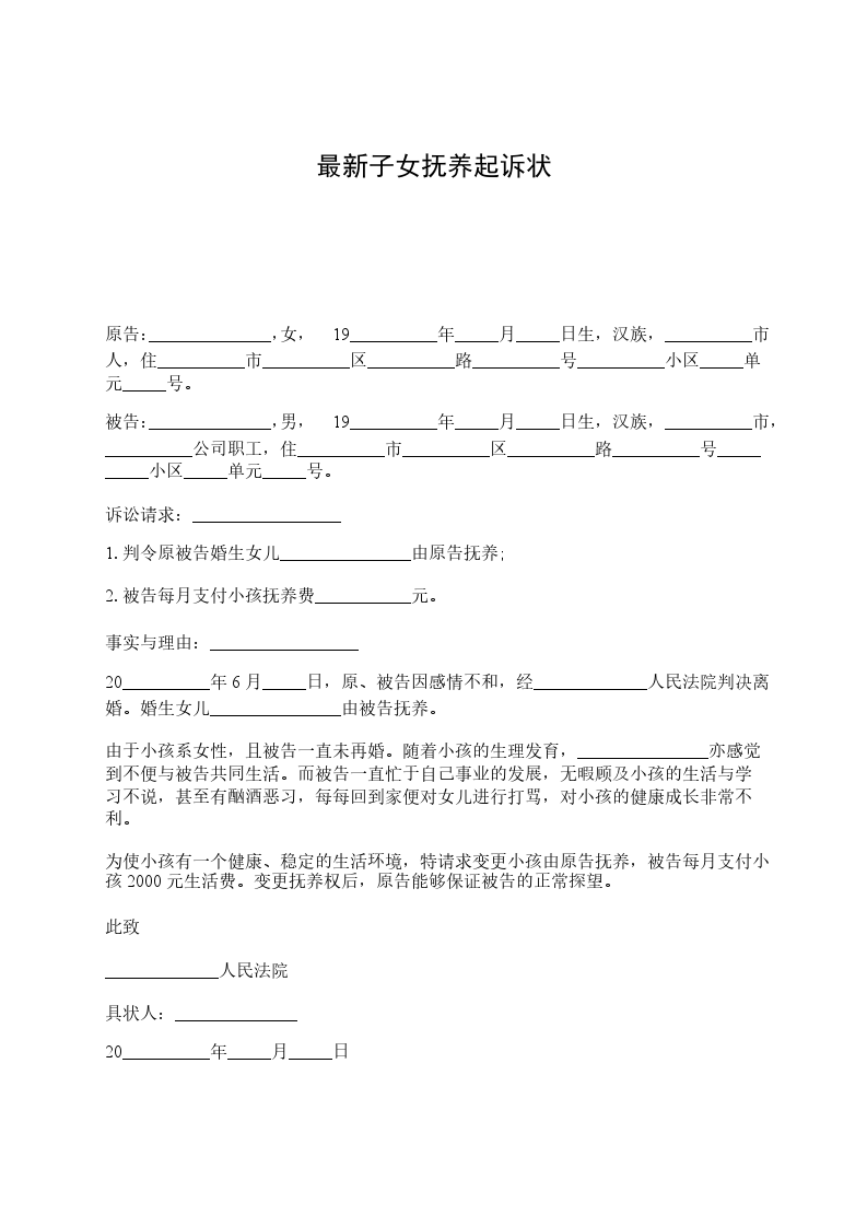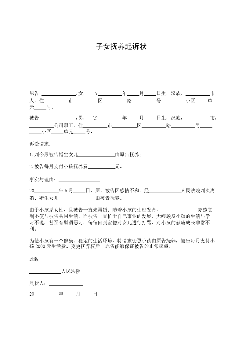 ______年____月____日,原、被告婚生女儿_______________出生,女儿出生后,原告一直在娘家生活至今,被告没看望过女儿,从未支付过抚养费,未尽父亲责任。为小孩有一个健康、稳定的生活环境,特请求小孩由原告抚养,被告每月支付小孩生活费。恳请法院判准上列诉讼请求。