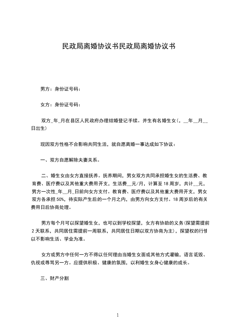 我们自愿离婚,完全同意协议书各项安排,亦无其他不同。本协议一式三份,男、女双方各执一份,婚姻登记处一份,具有同等法律效力。