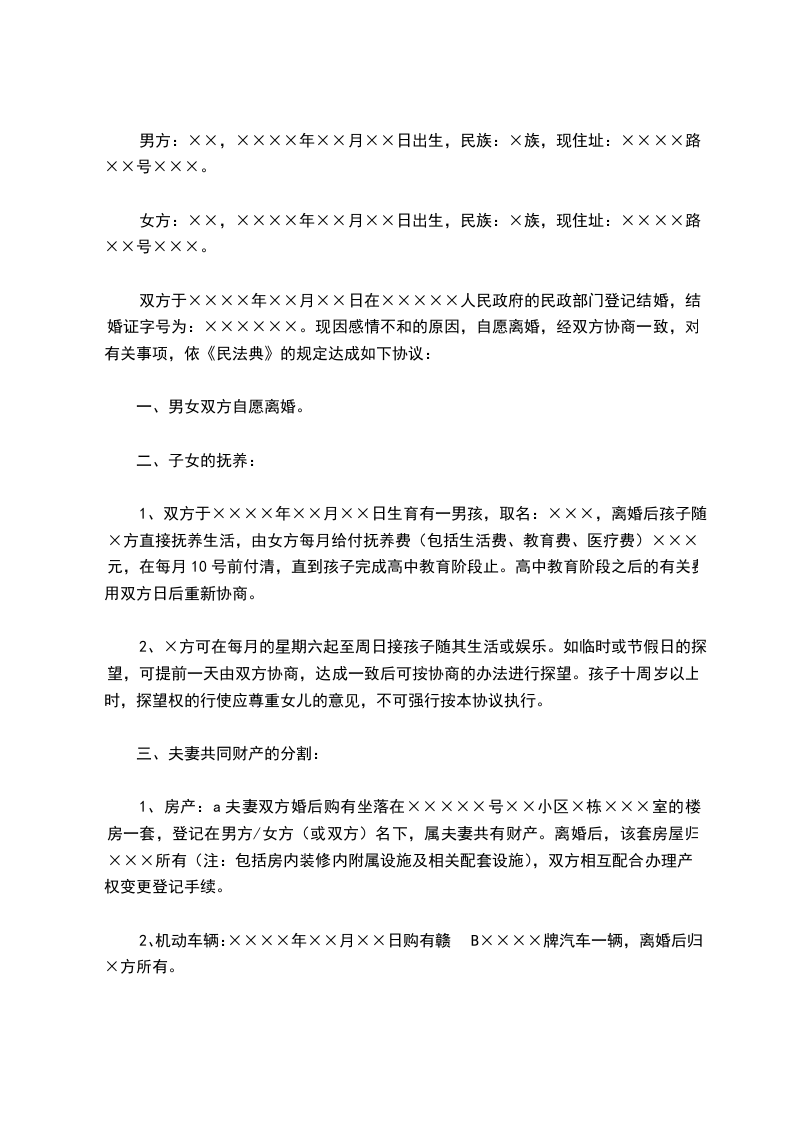 双方于××××年××月××日在×××××人民政府的民政部门登记结婚,结婚证字号为:××××××。现因感情不和的原因,自愿离婚,经双方协商一致,对有关事项,依《民法典》的规定达成如下协议: