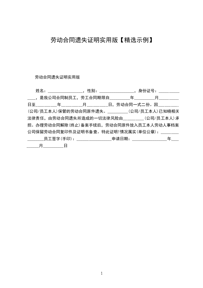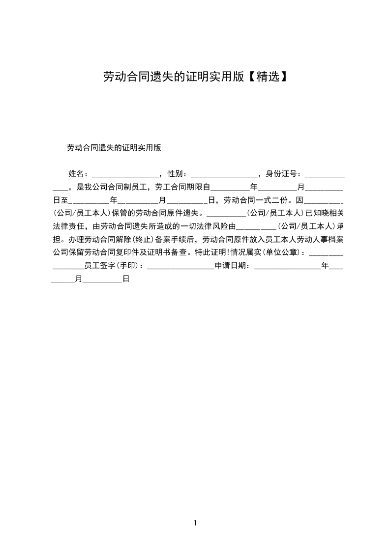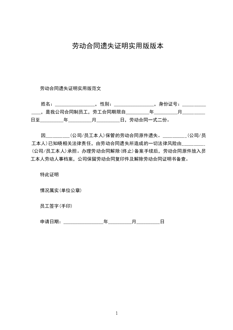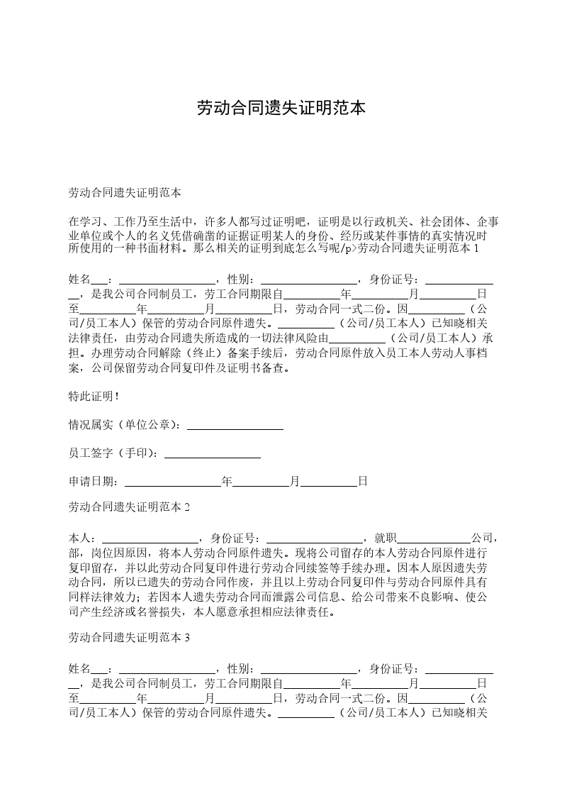 姓名:_________________,性别:_________________,身份证号:______________,是我公司合同制员工,劳工合同期限自__________年__________月__________日至__________年__________月__________日,劳动合同一式二份。因__________(公司/员工本人)保管的劳动合同原件遗失。__________(公司/员工本人)已知晓相关法律责任,由劳动合同遗失所造成的一切法律风险由__________(公司/员工本人)承担。办理劳动合同解除(终止)备案手续后,劳动合同原件放入员工本人劳动人事档案,公司保留劳动合同复印件及证明书备查。 特此证明! 情况属实(单位公章):_________________ 员工签字(手印):_________________ 申请日期:_________________年__________月__________日