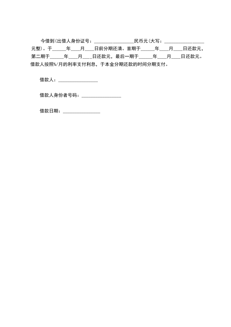 今借到(出借人身份证号:_________________民币元(大写:_________________元整)。于______年____月____日前分期还清。首期于______年____月____日还款元,第二期于______年____月____日还款元,最后一期于______年____月____日还款元。借款人按照%/月的利率支付利息,于本金分期还款的时间分期支付。