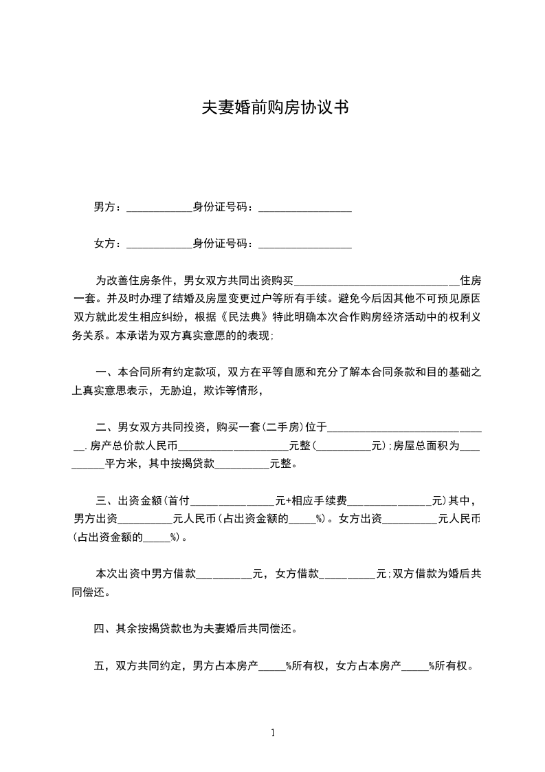 为改善住房条件,男女双方共同出资购买______________________________住房一套。并及时办理了结婚及房屋变更过户等所有手续。避免今后因其他不可预见原因双方就此发生相应纠纷,根据《民法典》特此明确本次合作购房经济活动中的权利义务关系。本承诺为双方真实意愿的的表现;