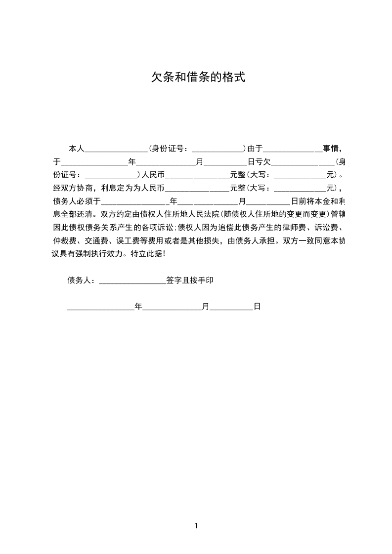 本人________________(身份证号:_____________)由于_______________事情,于_________________年_______________月___________日亏欠________________(身份证号:_____________)人民币________________元整(大写:_____________元)。经双方协商,利息定为为人民币________________元整(大写:_____________元),债务人必须于_________________年_______________月___________日前将本金和利息全部还清。双方约定由债权人住所地人民法院(随债权人住所地的变更而变更)管辖因此债权债务关系产生的各项诉讼;债权人因为追偿此债务产生的律师费、诉讼费、仲裁费、交通费、误工费等费用或者是其他损失,由债务人承担。双方一致同意本协议具有强制执行效力。特立此据!