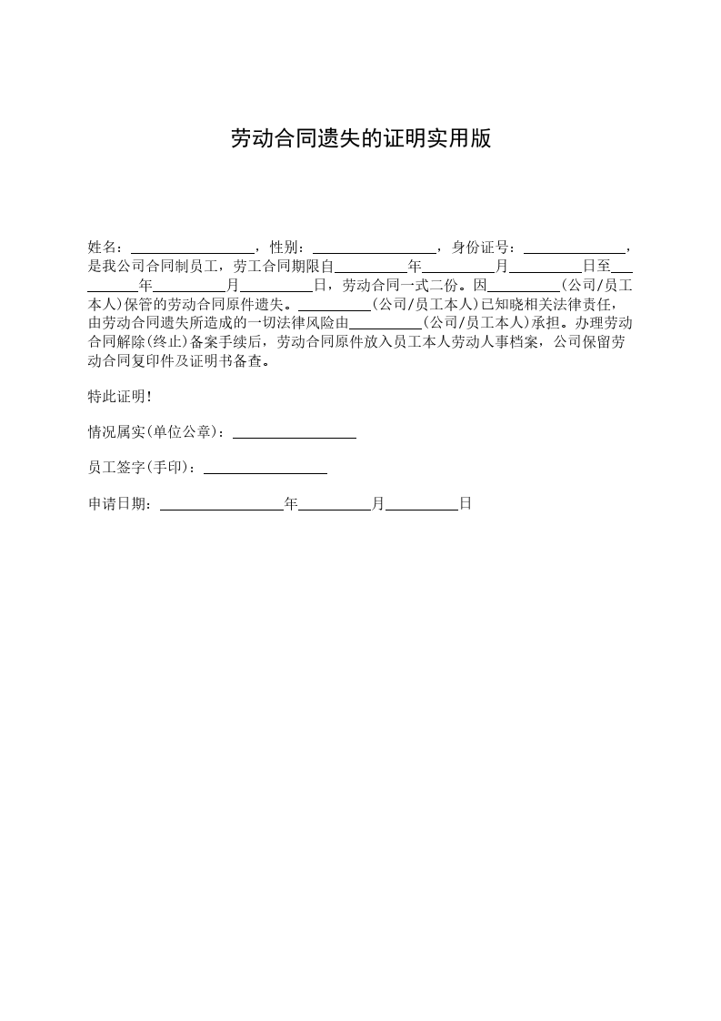 姓名:_________________,性别:_________________,身份证号:______________,是我公司合同制员工,劳工合同期限自__________年__________月__________日至__________年__________月__________日,劳动合同一式二份。因__________(公司/员工本人)保管的劳动合同原件遗失。__________(公司/员工本人)已知晓相关法律责任,由劳动合同遗失所造成的一切法律风险由__________(公司/员工本人)承担。办理劳动合同解除(终止)备案手续后,劳动合同原件放入员工本人劳动人事档案,公司保留劳动合同复印件及证明书备查。 特此证明! 情况属实(单位公章):_________________ 员工签字(手印):_________________ 申请日期:_________________年__________月__________日