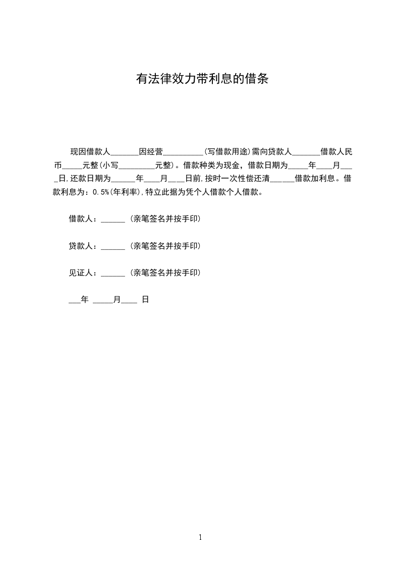 现因借款人_______因经营__________(写借款用途)需向贷款人_______借款人民币_____元整(小写_________元整)。借款种类为现金,借款日期为_____年____月____日,还款日期为______年____月____日前,按时一次性偿还清______借款加利息。借款利息为:0.5%(年利率),特立此据为凭个人借款个人借款。