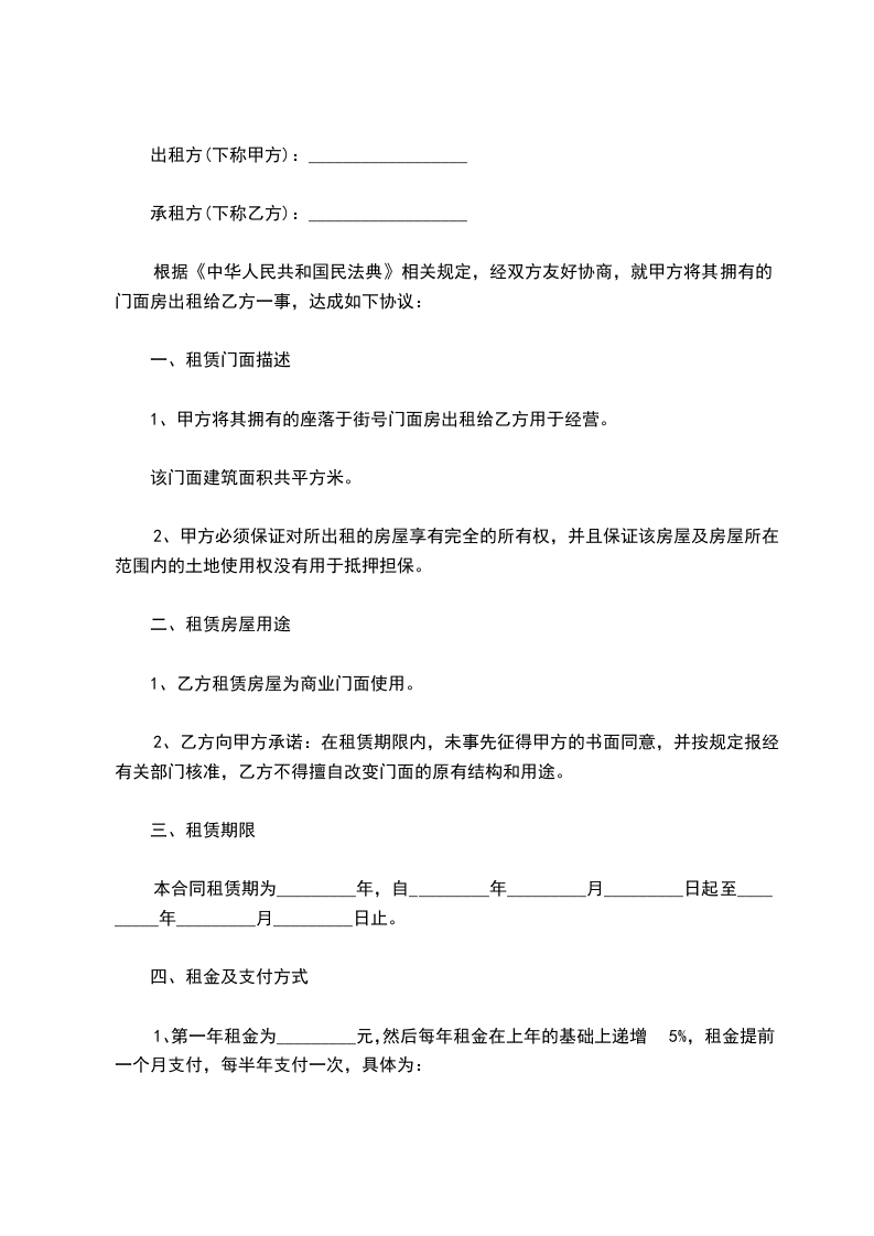 1、甲方将门面租给乙方,_____年_____月_____日至日止,月租金为
