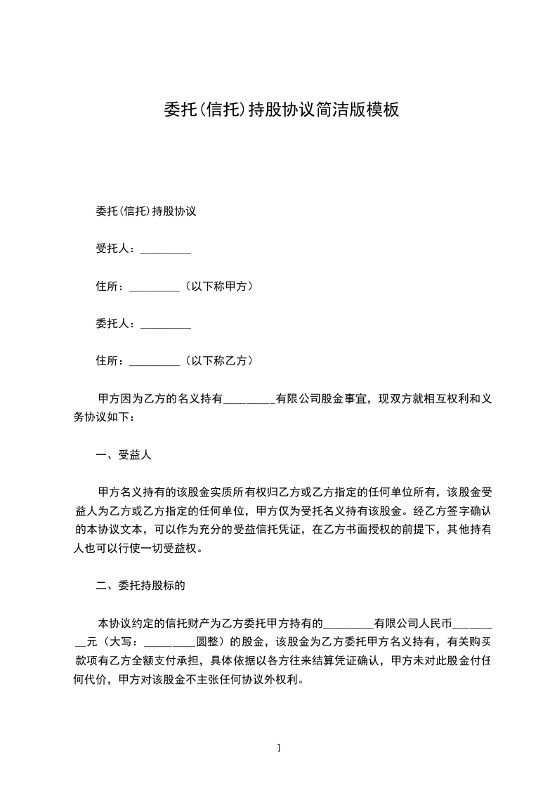 本协议约定的信托财产为乙方委托甲方持有的_________有限公司人民币_________元(大写:_________圆整)的股金,该股金为乙方委托甲方名义持有,有关购买款项有乙方全额支付承担,具体依据以各方往来结算凭证确认,甲方未对此股金付任何代价,甲方对该股金不主张任何协议外权利。