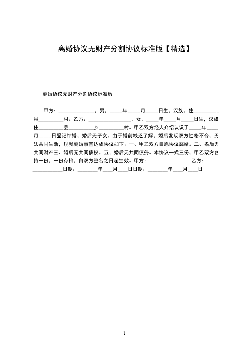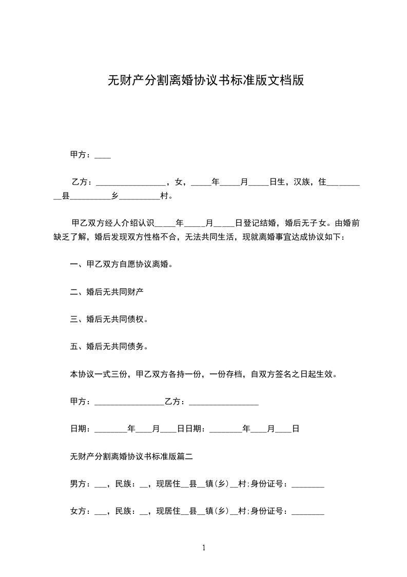 甲方:______________,男,_____年_____月_____日生,汉族,住__________县__________村。 乙方:_________________,女,_____年_____月_____日生,汉族,住__________县__________乡__________村。 甲乙双方经人介绍认识于_____年_____月_____日登记结婚,婚后无子女。由于婚前缺乏了解,婚后发现双方性格不合,无法共同生活,现就离婚事宜达成协议如下: 一、甲乙双方自愿协议离婚。 二、婚后无共同财产 三、婚后无共同债权。 五、婚后无共同债务。 本协议一式三份,甲乙双方各持一份,一份存档,自双方签名之日起生效。 甲方:_________________乙方:_________________ 日期:________年____月____日 日期:________年____月____日