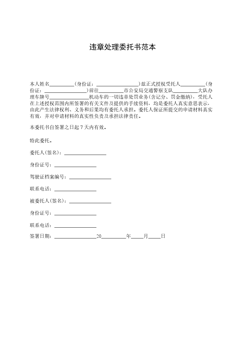 本人姓名__________(身份证:_________________)兹正式授权受托人__________(身份证:_________________)前往__________市公安局交通警察支队__________大队办理车牌号________________机动车的一切违章处罚业务(含记分、罚金缴纳),受托人在上述授权范围内所签署的有关文件及提供的手续资料,均是委托人真实意思表示,由此产生法律权利、义务和后果均有委托人承担。委托人保证所提交的申请材料真实有效,并对申请材料的真实性负责及承担法律责任。 本委托书自签署之日起7天内有效。 特此委托。 委托人(签名):_________________ 身份证号:_________________ 驾驶证档案编号:_________________ 联系电话:_________________ 被委托人(签名):_________________ 身份证号:_________________ 联系电话:_________________ 签署日期:_________________20__________年_____月_____日