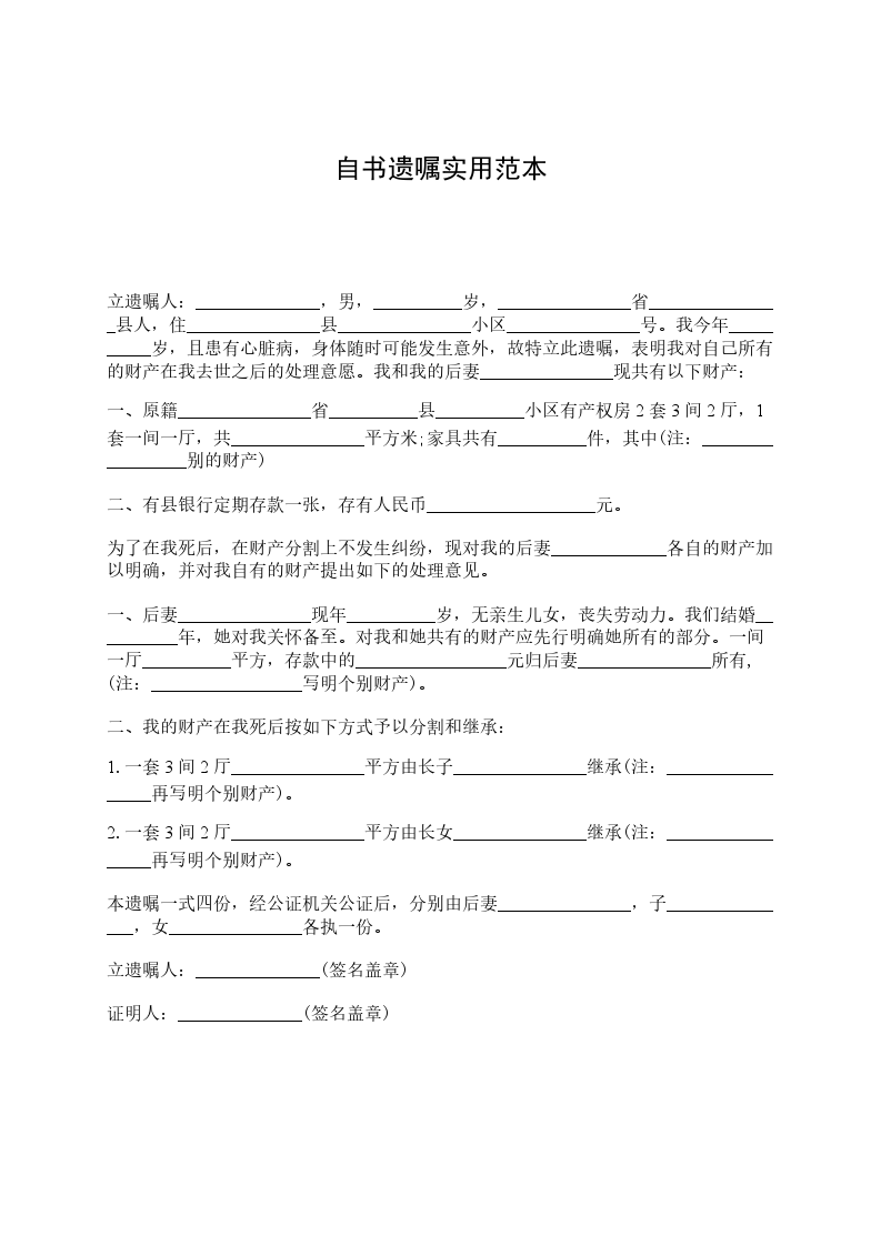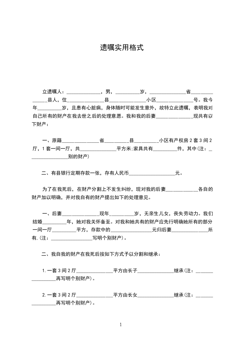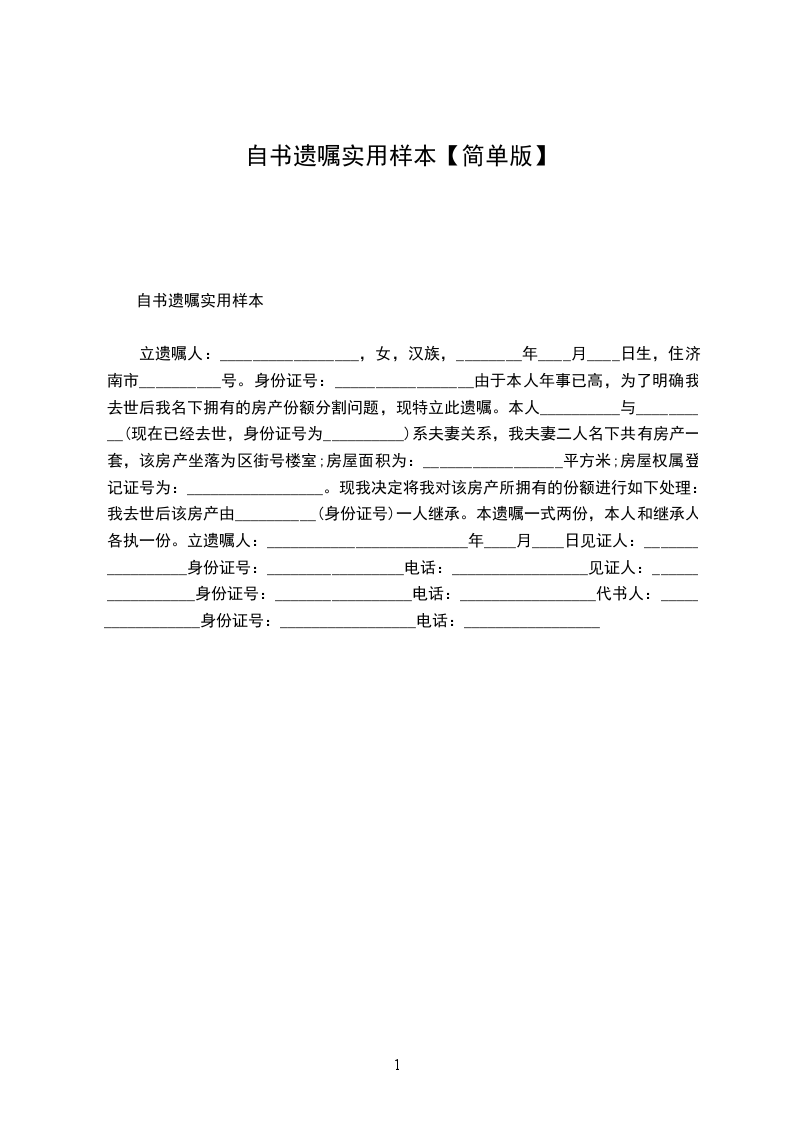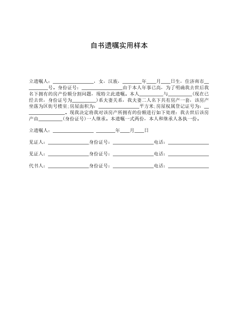 立遗嘱人:_________________,女,汉族,________年____月____日生,住济南市__________号。身份证号:_________________由于本人年事已高,为了明确我去世后我名下拥有的房产份额分割问题,现特立此遗嘱。本人__________与__________(现在已经去世,身份证号为__________)系夫妻关系,我夫妻二人名下共有房产一套,该房产坐落为区街号楼室;房屋面积为:_________________平方米;房屋权属登记证号为:_________________。现我决定将我对该房产所拥有的份额进行如下处理:我去世后该房产由__________(身份证号)一人继承。本遗嘱一式两份,本人和继承人各执一份。 立遗嘱人:_________________ ________年____月____日 见证人:_________________身份证号:_________________电话:_________________ 见证人:_________________身份证号:_________________电话:_________________ 代书人:_________________身份证号:_________________电话:_________________