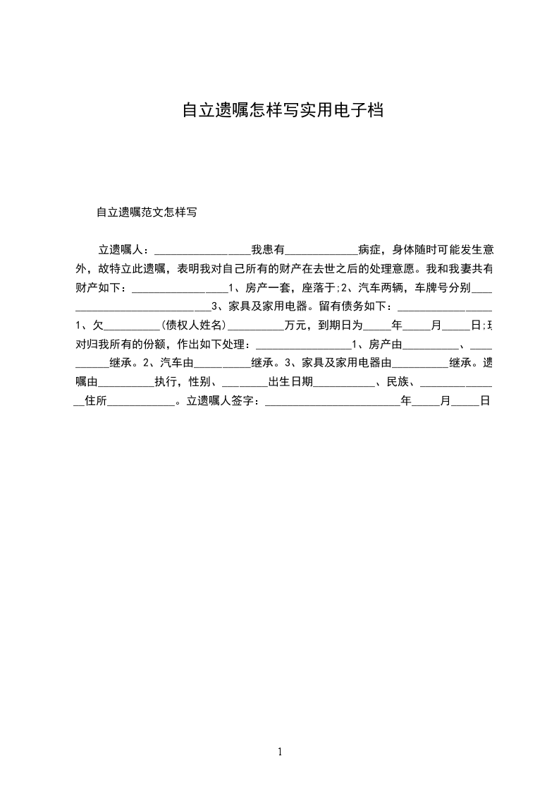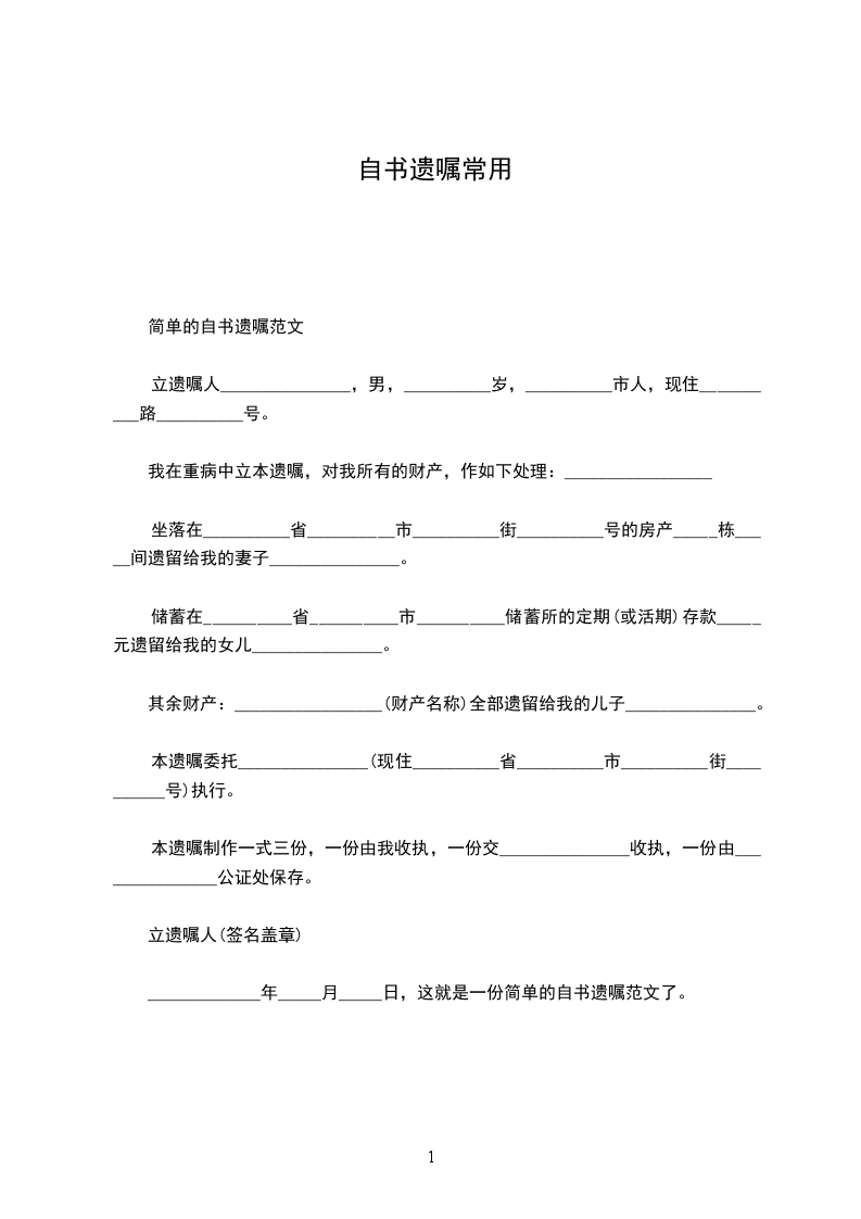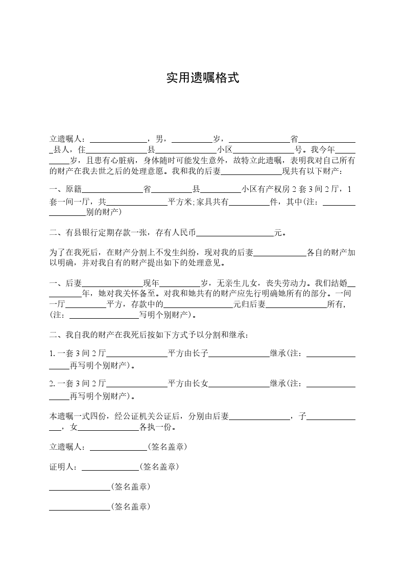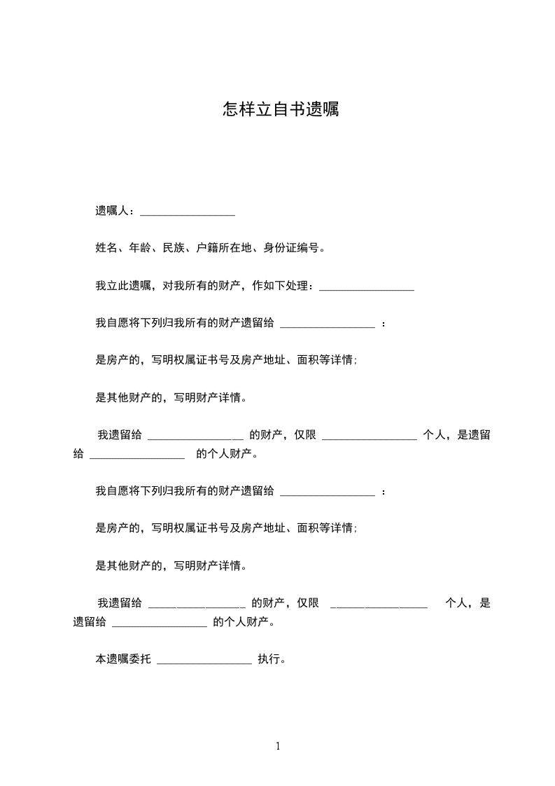 立遗嘱人:_________________,女,汉族,________年____月____日生,住济南市__________号。身份证号:_________________由于本人年事已高,为了明确我去世后我名下拥有的房产份额分割问题,现特立此遗嘱。本人__________与__________(现在已经去世,身份证号为__________)系夫妻关系,我夫妻二人名下共有房产一套,该房产坐落为区街号楼室;房屋面积为:_________________平方米;房屋权属登记证号为:_________________。现我决定将我对该房产所拥有的份额进行如下处理:我去世后该房产由__________(身份证号)一人继承。本遗嘱一式两份,本人和继承人各执一份。 立遗嘱人:_________________ ________年____月____日 见证人:_________________身份证号:_________________电话:_________________ 见证人:_________________身份证号:_________________电话:_________________ 代书人:_________________身份证号:_________________电话:_________________