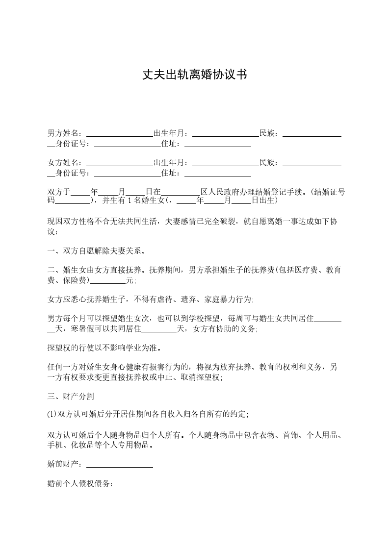 男方姓名:_________________出生年月:_________________民族:_________________身份证号:_________________住址:_________________ 女方姓名:_________________出生年月:_________________民族:_________________身份证号:_________________住址:_________________ 双方于_____年_____月_____日在__________区人民政府办理结婚登记手续。(结婚证号码_________),并生有1名婚生女(,_____年_____月_____日出生) 现因双方性格不合无法共同生活,夫妻感情已完全破裂,就自愿离婚一事达成如下协议: 一、双方自愿解除夫妻关系。 二、婚生女由女方直接抚养。抚养期间,男方承担婚生子的抚养费(包括医疗费、教育费、保险费)_________元; 女方应悉心抚养婚生子,不得有虐待、遗弃、家庭暴力行为; 男方每个月可以探望婚生女次,也可以到学校探望,每周可与婚生女共同居住_________天,寒暑假可以共同居住_________天,女方有协助的义务; 探望权的行使以不影响学业为准。 任何一方对婚生女身心健康有损害行为的,将视为放弃抚养、教育的权利和义务,另一方有权要求变更直接抚养权或中止、取消探望权; 三、财产分割 (1)双方认可婚后分开居住期间各自收入归各自所有的约定; 双方认可婚后个人随身物品归个人所有。个人随身物品中包含衣物、首饰、个人用品、手机、化妆品等个人专用物品。 婚前财产:_________________ 婚前个人债权债务:_________________ 婚姻存续期间个人债权债务:_________________ (2)女方自离婚证领取之日起,取得下列夫妻之间共同财产的所有权:彩电一台、冰箱一台、洗衣机一台、空调一台、家俱一套、组合音响一套、生活日用品件,总计约元; 银行存款元,归女方_________元,男方_________元;运营出租车,作价元,归女方_________元,男方_________元。 (3)双方确认无其它共同债权、无共同债务。 四、男方确认给女方经济补偿_________元; 五、离婚后,一方不得干扰另一方的生活,不得向第三方泄漏另一方的个人隐私和商业秘密,不得有故意损坏另一方名誉的行为,否则承担违约金_____元。 六、双方确认对方是完全民事行为能力的人,能够自行处分自己的行为和财产。 七、本协议经双方签字后,待有效的法律文书生效时具有法律效力。双方承诺对该协议书的字词义非常清楚,并愿意完全履行本协议书,不存在受到胁迫、欺诈、误解情形。 八、本协议书一式三份,甲乙双方各执一份,婚姻登记部门保留一份。在双方签字,并经婚姻登记机关办理相应手续后生效。 男方:_________________女方:_________________ _____年_____月_____日 _____年_____月_____日