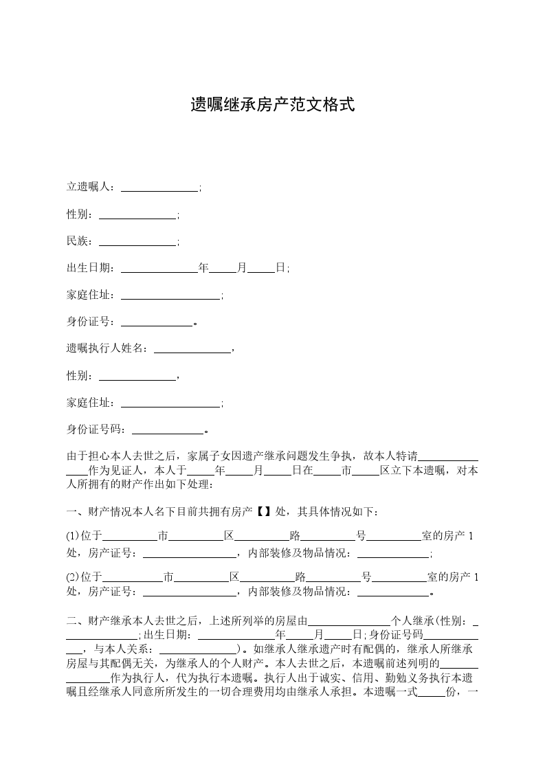 立遗嘱人:______________; 性别:______________; 民族:______________; 出生日期:______________年_____月_____日; 家庭住址:__________________; 身份证号:_____________。 遗嘱执行人姓名:______________, 性别:______________, 家庭住址:__________________; 身份证号码:_____________。 由于担心本人去世之后,家属子女因遗产继承问题发生争执,故本人特请_______________作为见证人,本人于_____年_____月_____日在_____市_____区立下本遗嘱,对本人所拥有的财产作出如下处理: 一、财产情况本人名下目前共拥有房产【】处,其具体情况如下: (1)位于__________市__________区__________路__________号__________室的房产1处,房产证号:_________________,内部装修及物品情况:_____________; (2)位于___________市__________区__________路__________号__________室的房产1处,房产证号:_________________,内部装修及物品情况:_____________。 二、财产继承本人去世之后,上述所列举的房屋由_______________个人继承(性别:______________;出生日期:______________年_____月_____日;身份证号码_____________,与本人关系:______________)。如继承人继承遗产时有配偶的,继承人所继承房屋与其配偶无关,为继承人的个人财产。本人去世之后,本遗嘱前述列明的_______________作为执行人,代为执行本遗嘱。执行人出于诚实、信用、勤勉义务执行本遗嘱且经继承人同意所所发生的一切合理费用均由继承人承担。本遗嘱一式_____份,一份交_______________,一份交_______________。本人在此明确,订立本遗嘱期间本人神智清醒且就订立该遗嘱未受到任何胁迫、欺诈,上述遗嘱为本人自愿作出,是本人内心真实意思的表示。本人其他亲属或任何第三人均不得以任何理由对继承人继承本人所有的上述房屋进行干涉。 见证人(签字):______________ 立遗嘱人(签字):______________ 日期:______________年_____月_____日