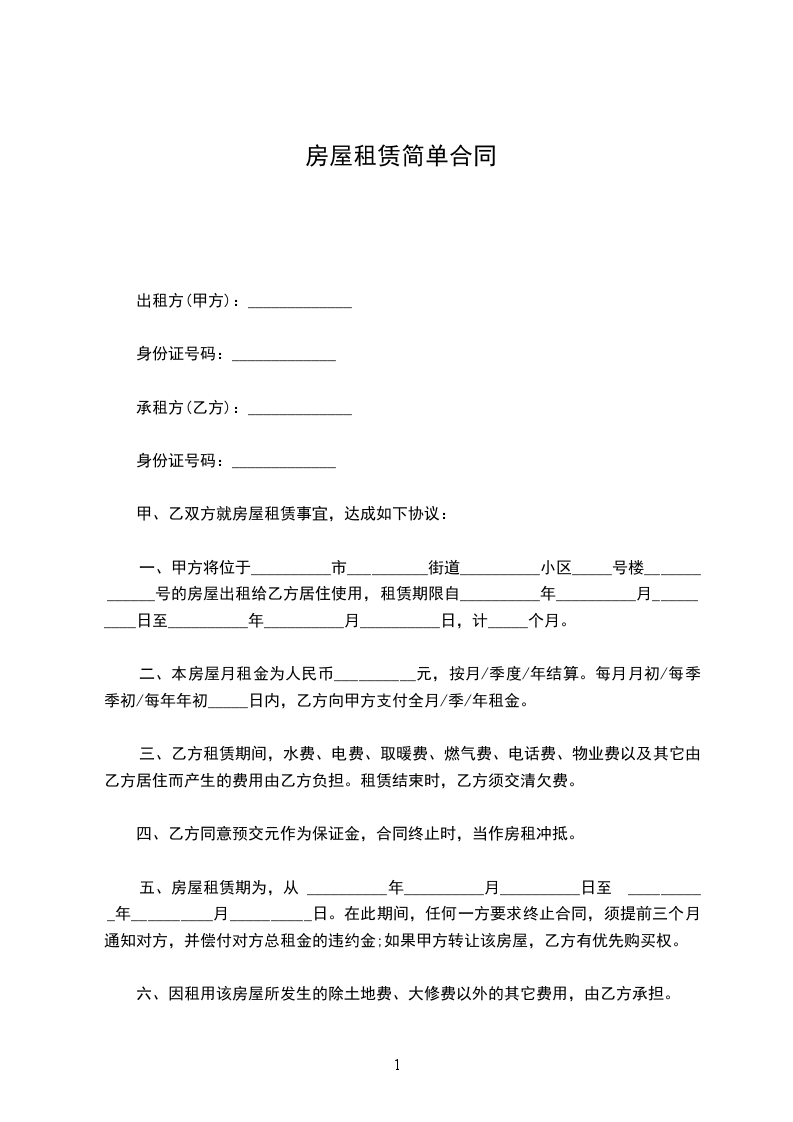 一、甲方将位于__________市__________街道__________小区_____号楼_____________号的房屋出租给乙方居住使用,租赁期限自__________年__________月__________日至__________年__________月__________日,计_____个月。