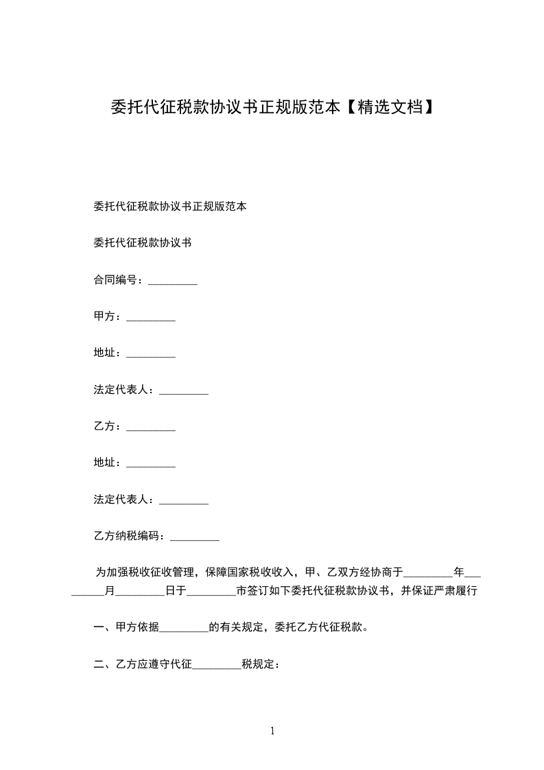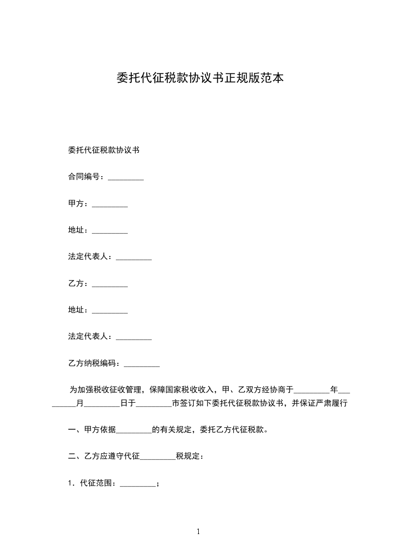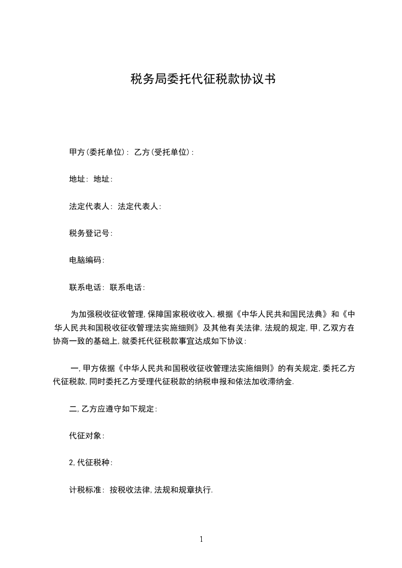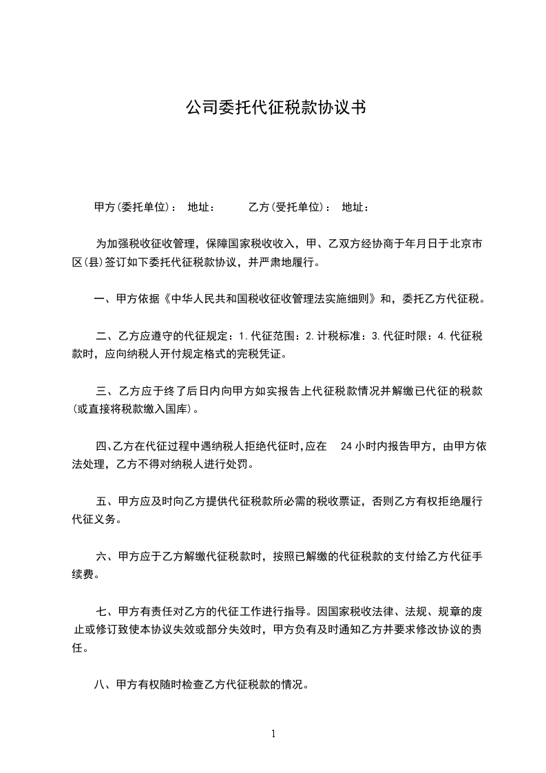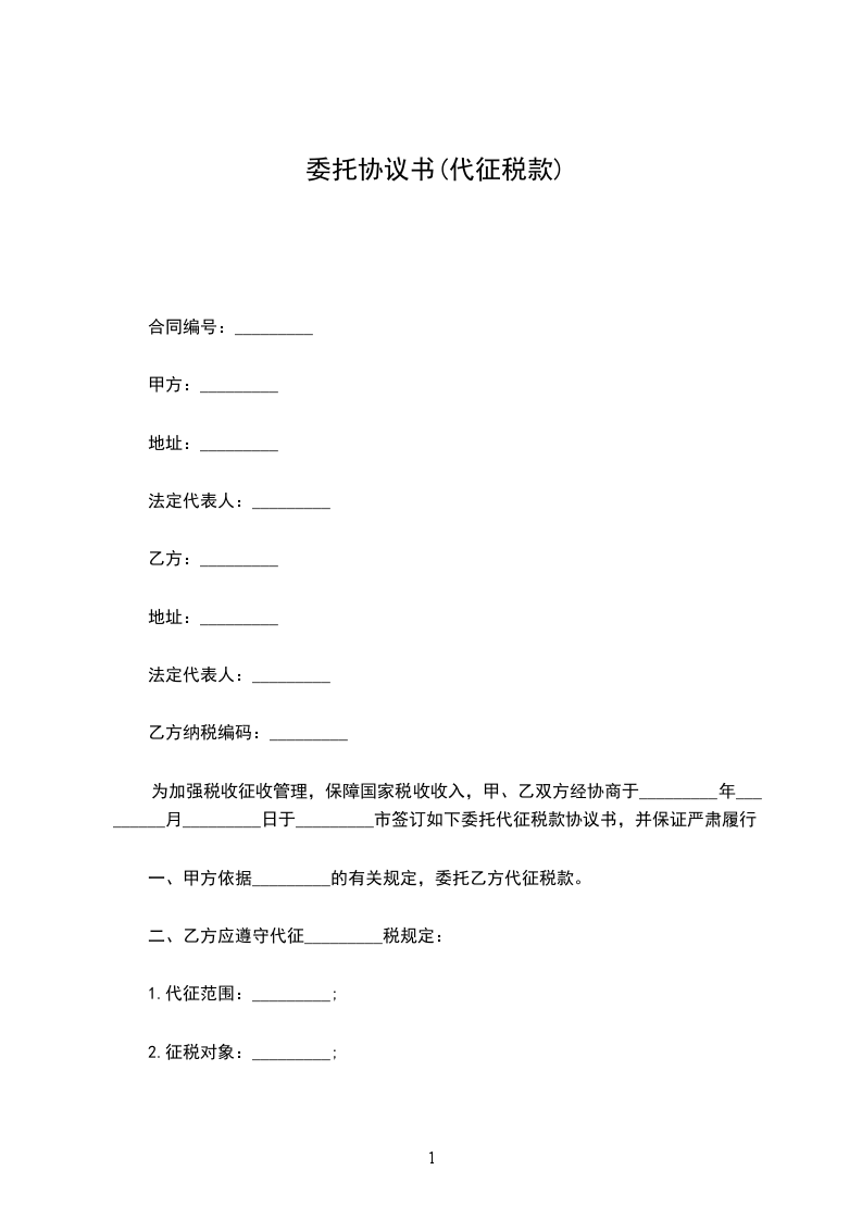 为加强税收征收管理,保障国家税收收入,甲、乙双方经协商于_________年_________月_________日于_________市签订如下委托代征税款协议书,并保证严肃履行。