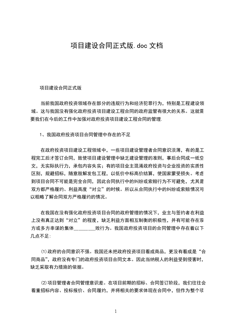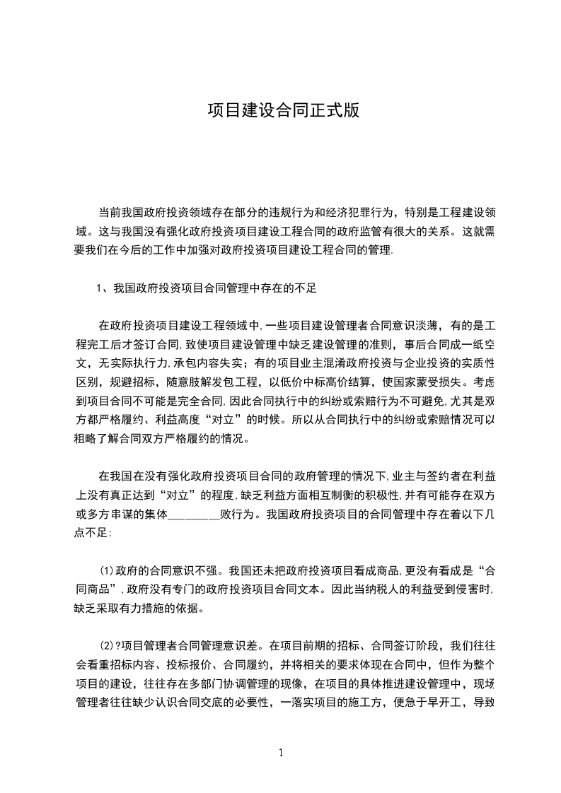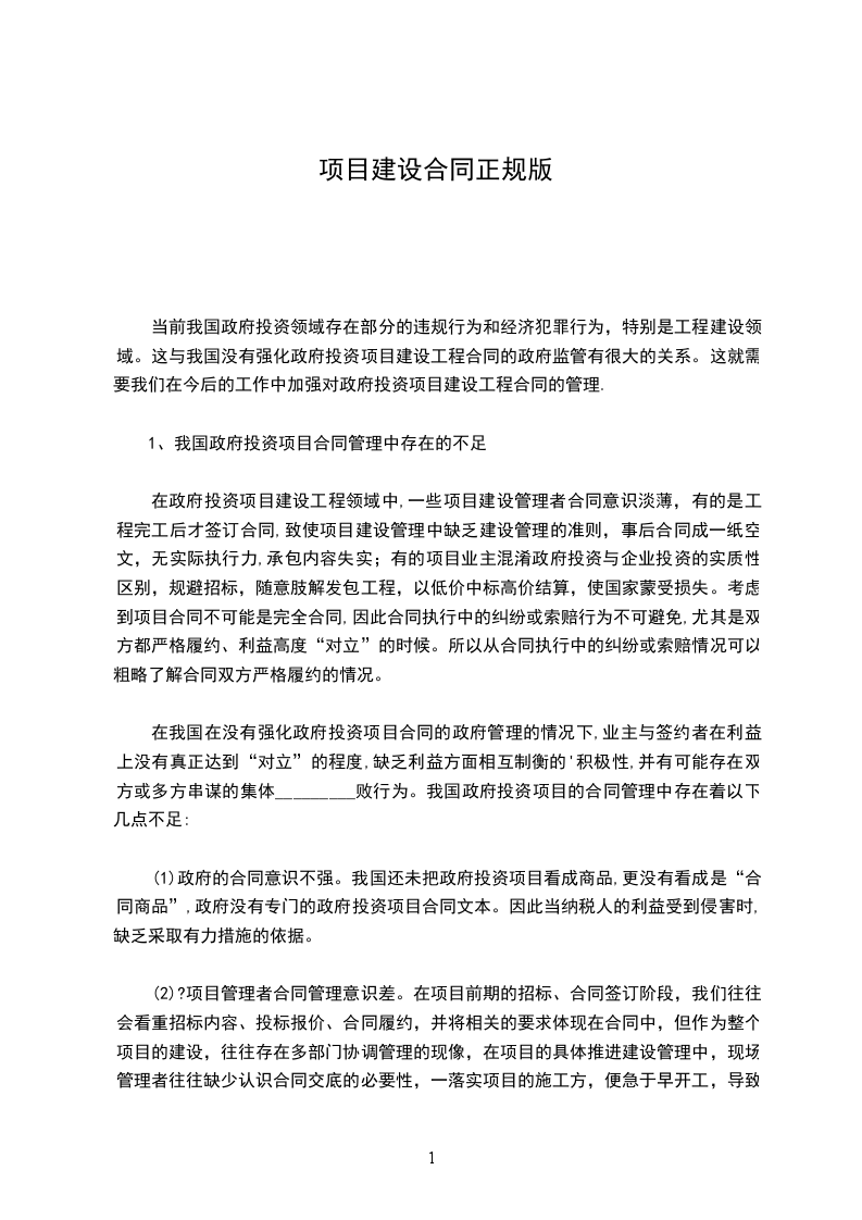 1、我国政府投资项目合同管理中存在的不足