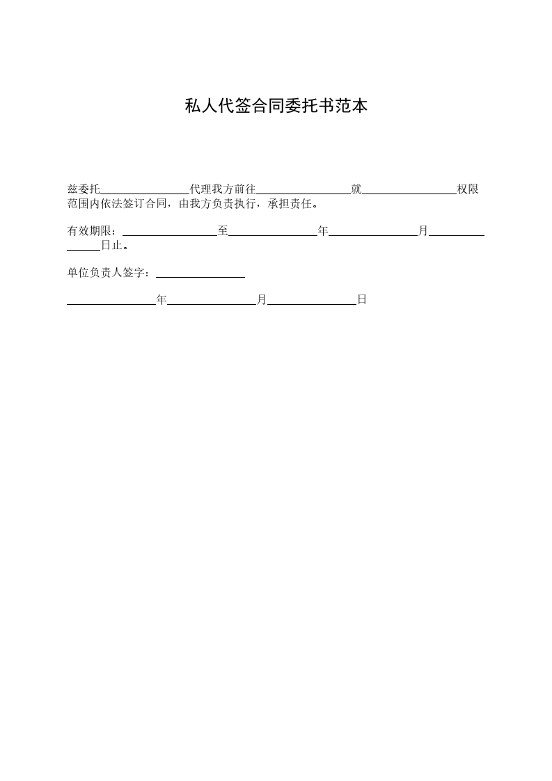 兹委托________________代理我方前往_________________就_________________权限范围内依法签订合同,由我方负责执行,承担责任。 有效期限:_________________至________________年________________月________________日止。 单位负责人签字:________________ ________________年________________月________________日