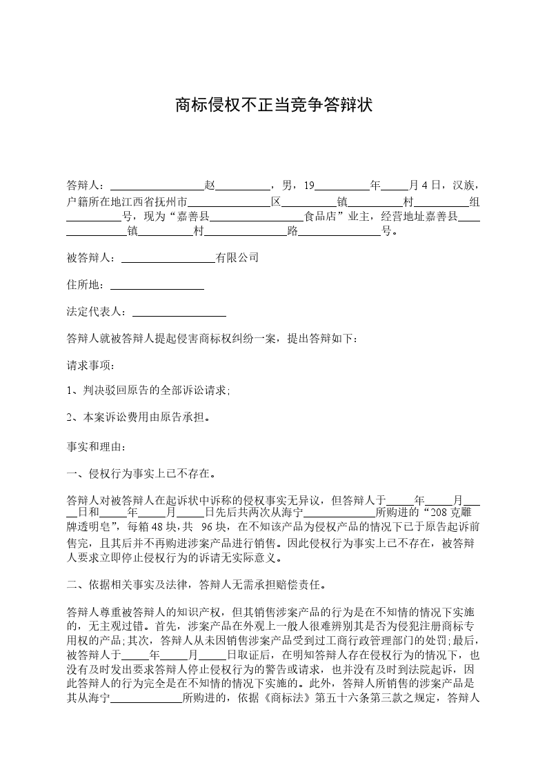 答辩人:_________________赵__________,男,19__________年_____月4日,汉族,户籍所在地江西省抚州市_______________区__________镇__________村__________组__________号,现为“嘉善县_________________食品店”业主,经营地址嘉善县_______________镇__________村_______________路_______________号。 被答辩人:_________________有限公司 住所地:_________________ 法定代表人:_________________ 答辩人就被答辩人提起侵害商标权纠纷一案,提出答辩如下: 请求事项: 1、判决驳回原告的全部诉讼请求; 2、本案诉讼费用由原告承担。 事实和理由: 一、侵权行为事实上已不存在。 答辩人对被答辩人在起诉状中诉称的侵权事实无异议,但答辩人于_____年_____月_____日和_____年_____月_____日先后共两次从海宁_____________所购进的“208克雕牌透明皂”,每箱48块,共96块,在不知该产品为侵权产品的情况下已于原告起诉前售完,且其后并不再购进涉案产品进行销售。因此侵权行为事实上已不存在,被答辩人要求立即停止侵权行为的诉请无实际意义。 二、依据相关事实及法律,答辩人无需承担赔偿责任。 答辩人尊重被答辩人的知识产权,但其销售涉案产品的行为是在不知情的情况下实施的,无主观过错。首先,涉案产品在外观上一般人很难辨别其是否为侵犯注册商标专用权的产品;其次,答辩人从未因销售涉案产品受到过工商行政管理部门的处罚;最后,被答辩人于_____年_____月_____日取证后,在明知答辩人存在侵权行为的情况下,也没有及时发出要求答辩人停止侵权行为的警告或请求,也并没有及时到法院起诉,因此答辩人的行为完全是在不知情的情况下实施的。此外,答辩人所销售的涉案产品是其从海宁_____________所购进的,依据《商标法》第五十六条第三款之规定,答辩人无需承担赔偿责任。 综上所述,答辩人请求贵院依法公断。 此致 ___________人民法院 答辩人:_________________ ___________年___________月___________日