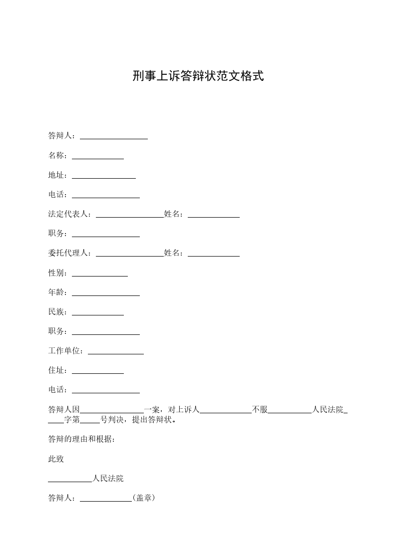 答辩人:_________________ 名称:_____________ 地址:________________ 电话:_________________ 法定代表人:_________________姓名:_____________ 职务:_________________ 委托代理人:_________________姓名:_____________ 性别:______________ 年龄:_________________ 民族:_____________ 职务:_________________ 工作单位:______________ 住址:_____________ 电话:_________________ 答辩人因________________一案,对上诉人_____________不服___________人民法院_____字第_____号判决,提出答辩状。 答辩的理由和根据: 此致 ___________人民法院 答辩人:_____________(盖章) 法定代表人:_____________(签章) __________年_____月_____日