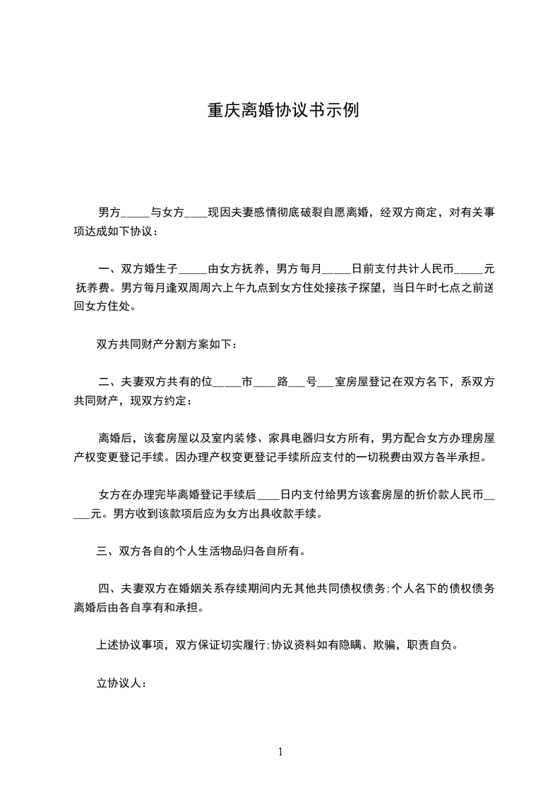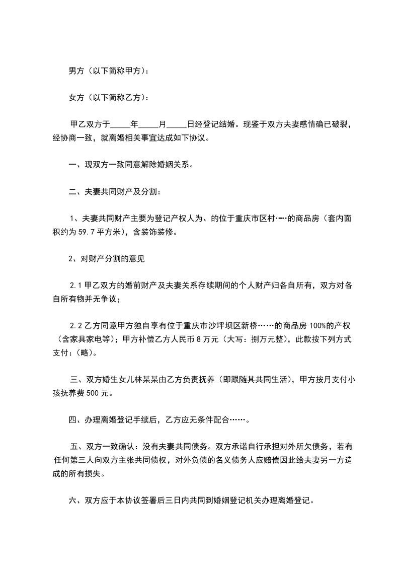 2.2乙方同意甲方独自享有位于重庆市沙坪坝区新桥……的商品房100%的产权(含家具家电等);甲方补偿乙方人民币8万元(大写:捌万元整),此款按下列方式支付:(略)。