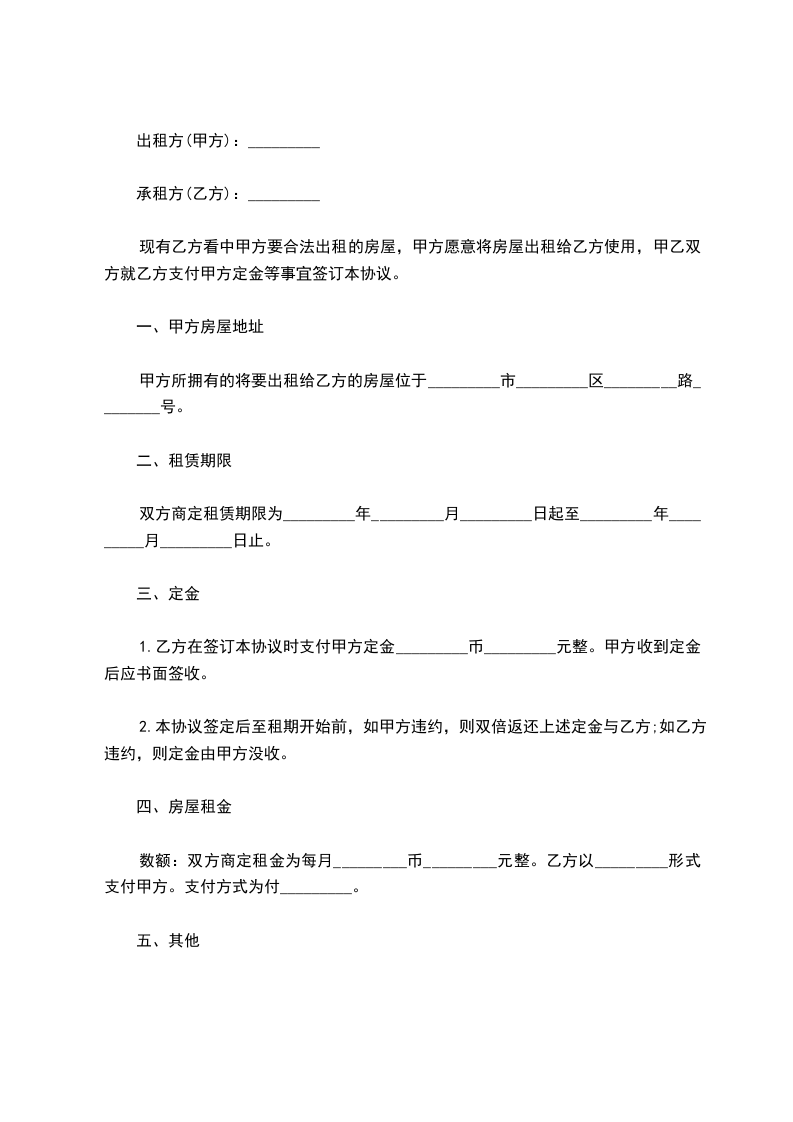 现有乙方看中甲方要合法出租的房屋,甲方愿意将房屋出租给乙方使用,甲乙双方就乙方支付甲方定金等事宜签订本协议。
