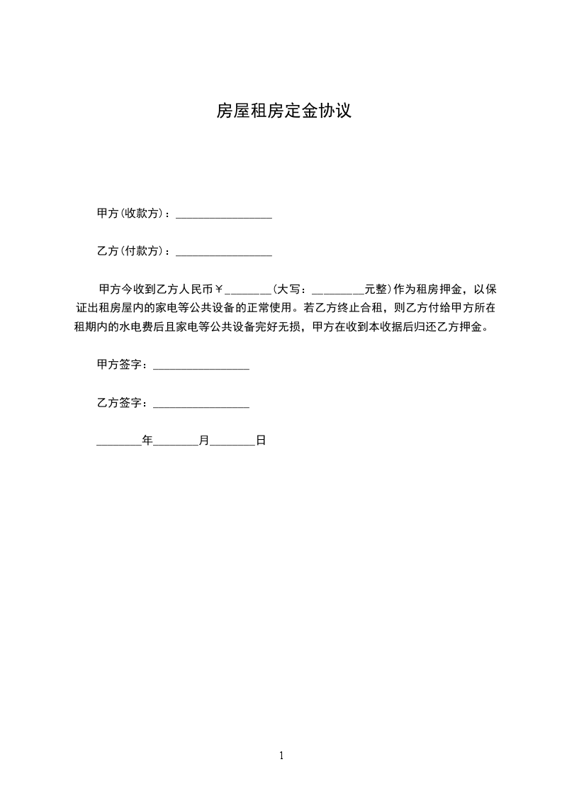 1.乙方在签订本协议时支付甲方定金_________币_________元整。甲方收到定金后应书面签收。