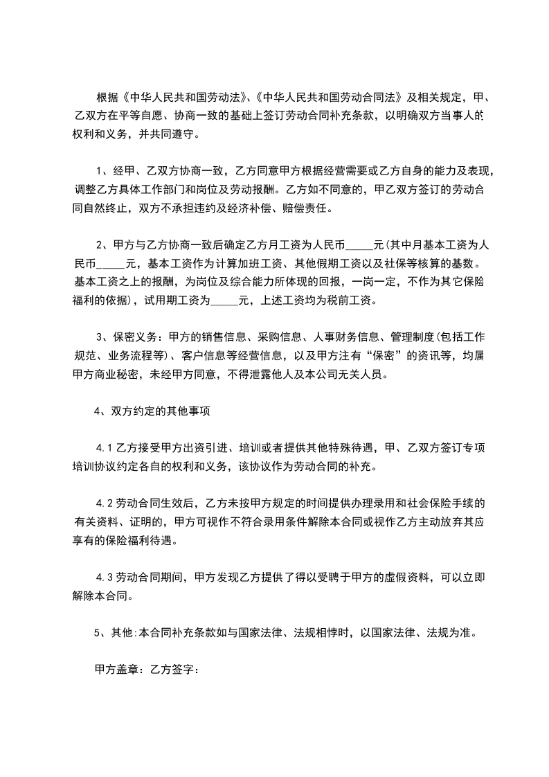根据《中华人民共和国劳动法》、《中华人民共和国劳动合同法》及相关规定,甲、乙双方在平等自愿、协商一致的基础上签订劳动合同补充条款,以明确双方当事人的权利和义务,并共同遵守。