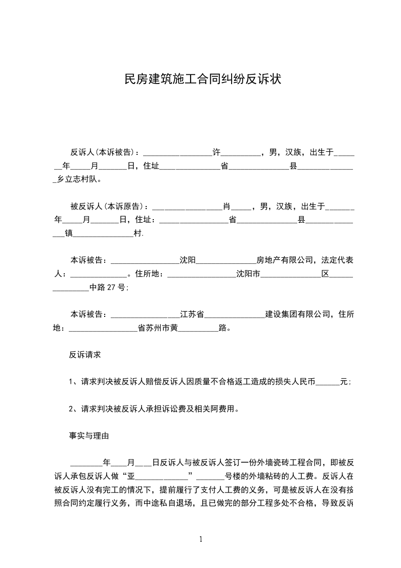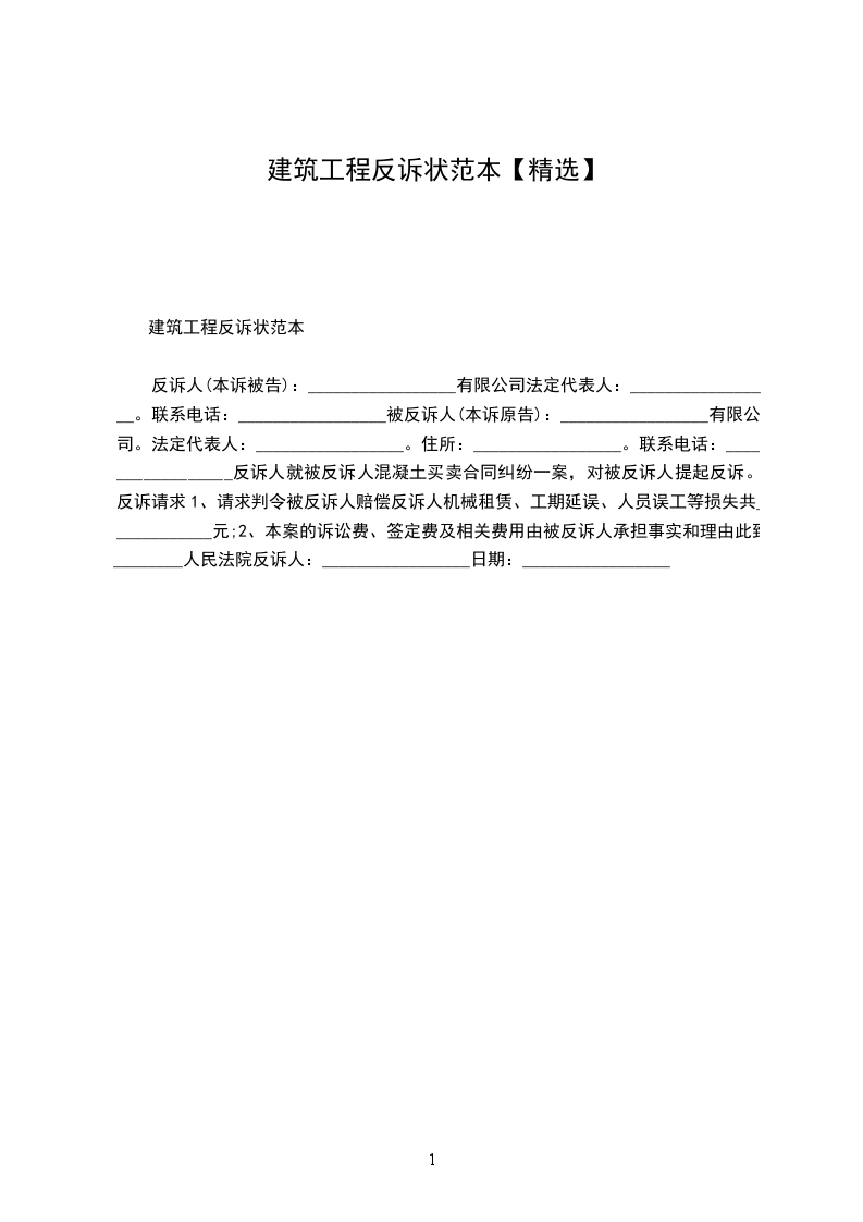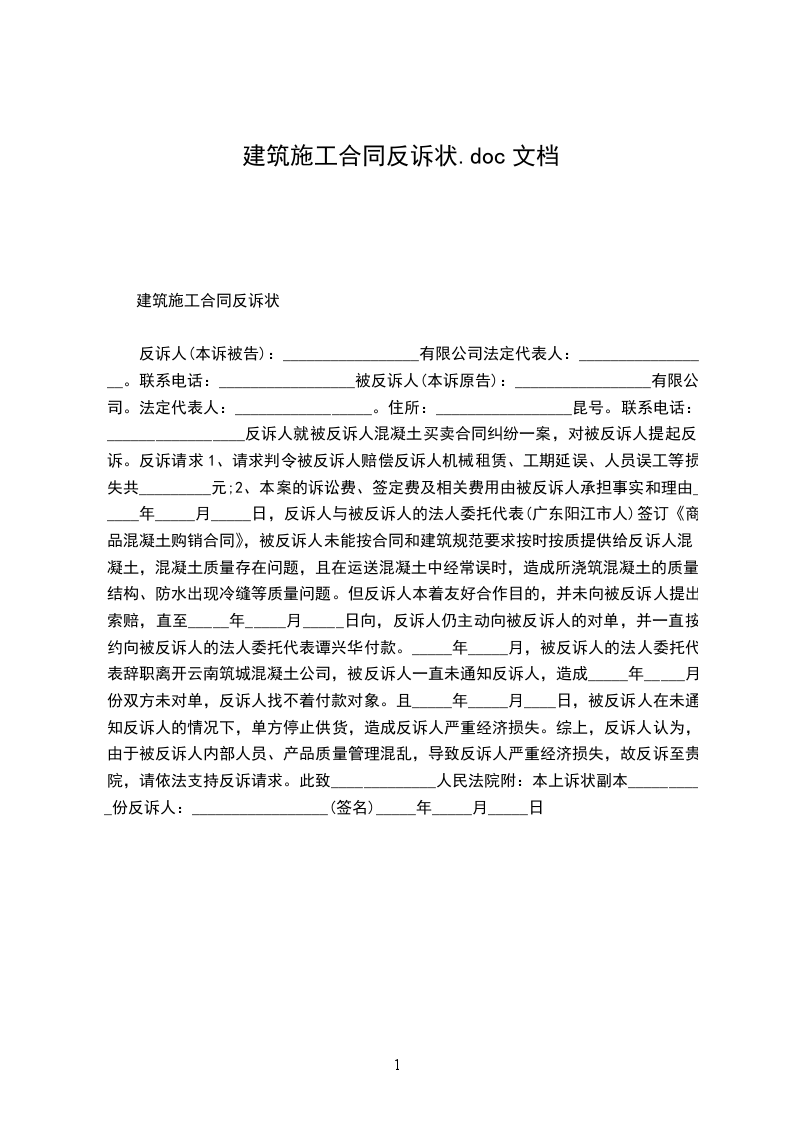 反诉人(本诉被告):_________________有限公司 法定代表人:_________________。 联系电话:_________________被反诉人(本诉原告):_________________有限公司。 法定代表人:_________________。 住所:_________________昆号。 联系电话:_________________ 反诉人就被反诉人混凝土买卖合同纠纷一案,对被反诉人提起反诉。 反诉请求 1、请求判令被反诉人赔偿反诉人机械租赁、工期延误、人员误工等损失共_________元; 2、本案的诉讼费、签定费及相关费用由被反诉人承担 事实和理由 _____年_____月_____日,反诉人与被反诉人的法人委托代表(广东阳江市人)签订《商品混凝土购销合同》,被反诉人未能按合同和建筑规范要求按时按质提供给反诉人混凝土,混凝土质量存在问题,且在运送混凝土中经常误时,造成所浇筑混凝土的质量、结构、防水出现冷缝等质量问题。但反诉人本着友好合作目的,并未向被反诉人提出索赔,直至_____年_____月_____日向,反诉人仍主动向被反诉人的对单,并一直按约向被反诉人的法人委托代表谭兴华付款。_____年_____月,被反诉人的法人委托代表辞职离开云南筑城混凝土公司,被反诉人一直未通知反诉人,造成_____年_____月份双方未对单,反诉人找不着付款对象。且_____年_____月____日,被反诉人在未通知反诉人的情况下,单方停止供货,造成反诉人严重经济损失。 综上,反诉人认为,由于被反诉人内部人员、产品质量管理混乱,导致反诉人严重经济损失,故反诉至贵院,请依法支持反诉请求。 此致 _____________人民法院 附:本上诉状副本__________份 反诉人:_________________(签名) _____年_____月_____日